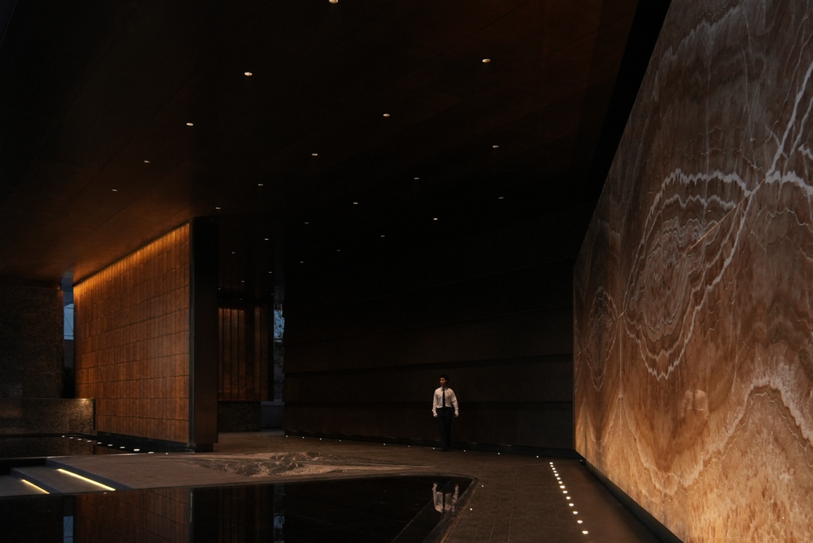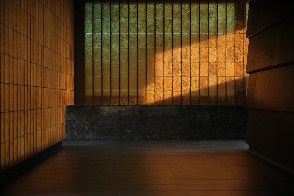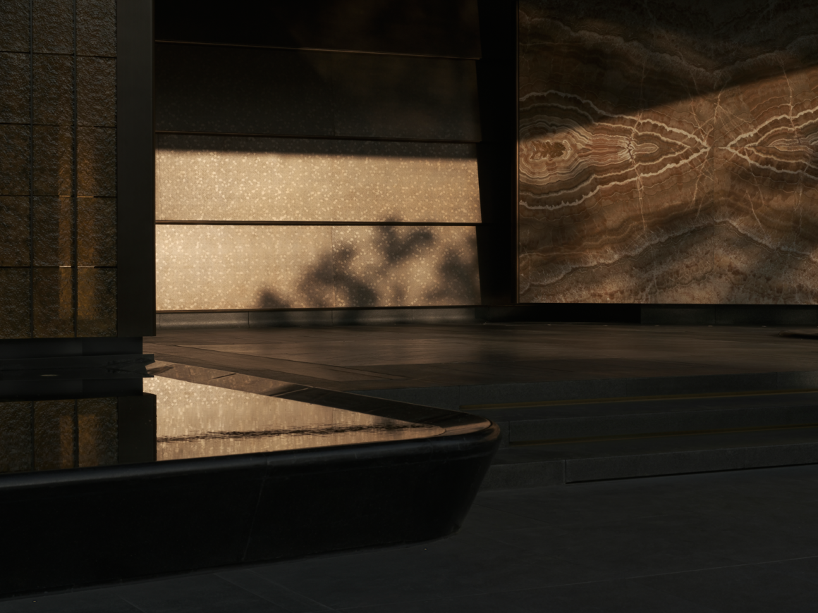 古言 “宅以门户为冠带”,东方礼制中格外注重的家宅门户文化,乌金琉璃里光影碎金的晃动,金光麻与红宝石大理石铺贴立面,提取于北京的东方色彩丹韵银律。门厅宽而耸高,但被我们刻意调暗了步入时光线的渗透,当从闹市之中步入幽微,只看到大理石反射出的明暗暖光,通过弱化光线达到舒缓与放松。
