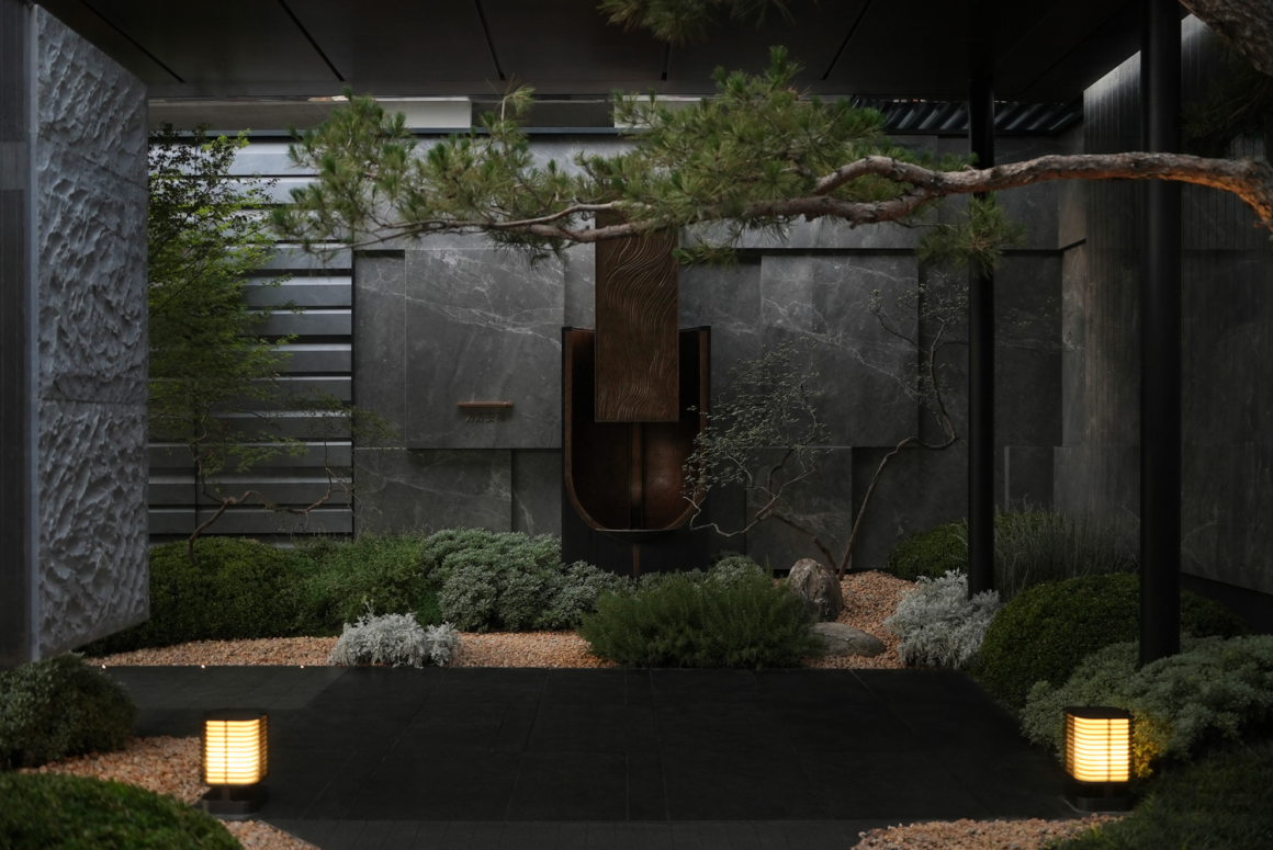 Passing through the “mountain gate,” one’s gaze is drawn to an ancient, century-old crape myrtle, leaning gracefully. It blossoms from summer through autumn, while water flows along the base of a screen wall, the source of the garden’s vitality. The walls on either side leave a central space, creating a hazy sense of borrowed scenery, typical of Chinese gardens, where one can see through, but not walk through. The crape myrtle blossoms, illuminated by the light, adorn the wall. In the inner courtyard, a robust and gnarled Mount Tai pine stands, breaking through the courtyard, while a forged copper water feature reflects the light and shadows of the sky. Hand-chiseled marks, themed on the folds of natural mountains and rivers, allow the static water to carry the flow of time – a restrained and subtle profundity.
