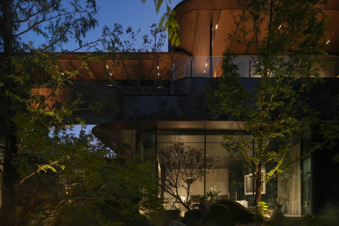 整体骨相是双层互为借景的垂直立体空间,下沉会所浮岛中庭为核心,而围绕中庭则结合退台式的平面布局错动咬合形成多进的空间,亭、廊等建筑体量如散置的聚落,它们既独立成景,又被同一片庭院气脉所联结,形成了深邃幽远的 “园中之园”。