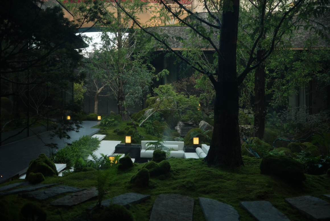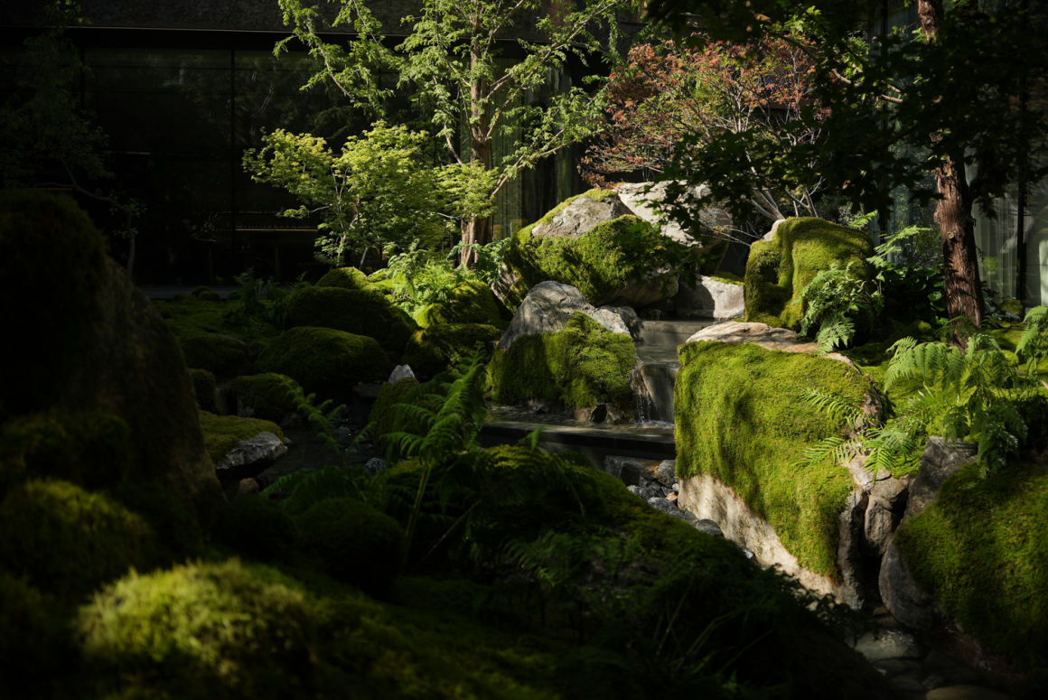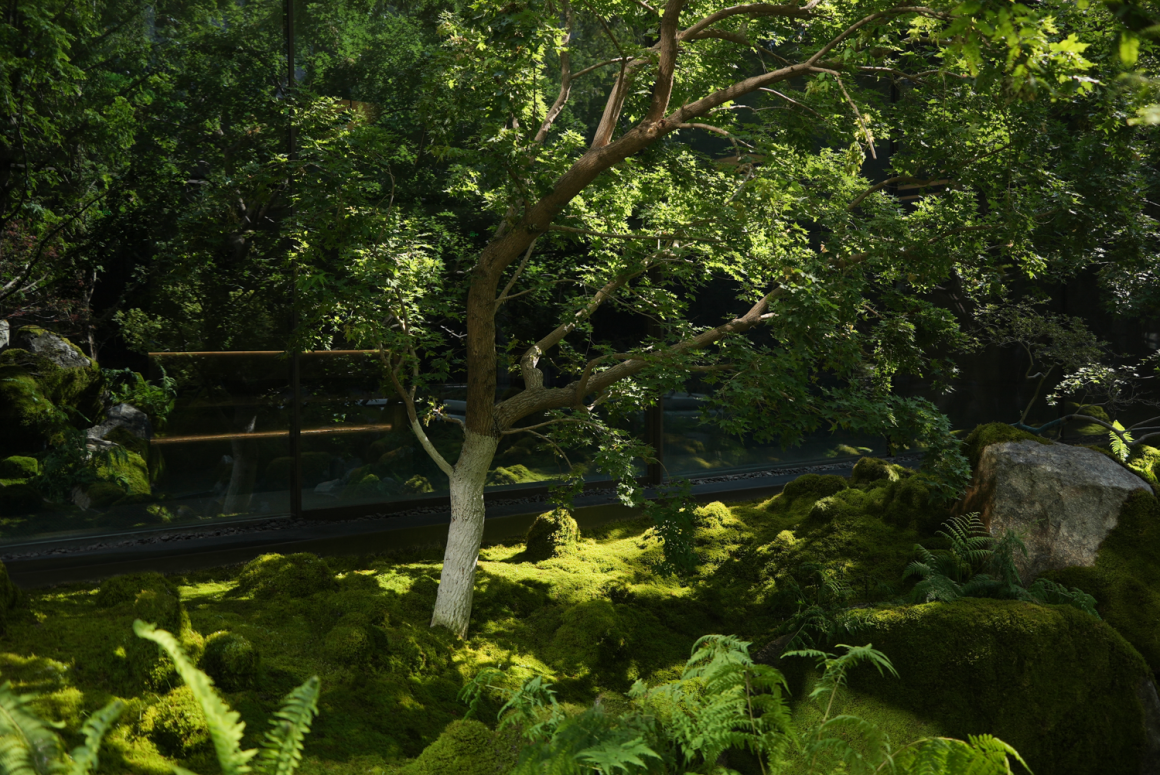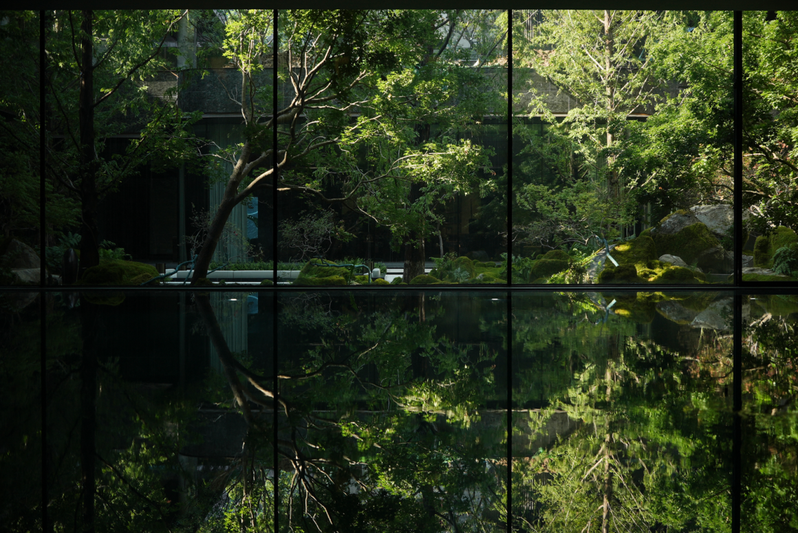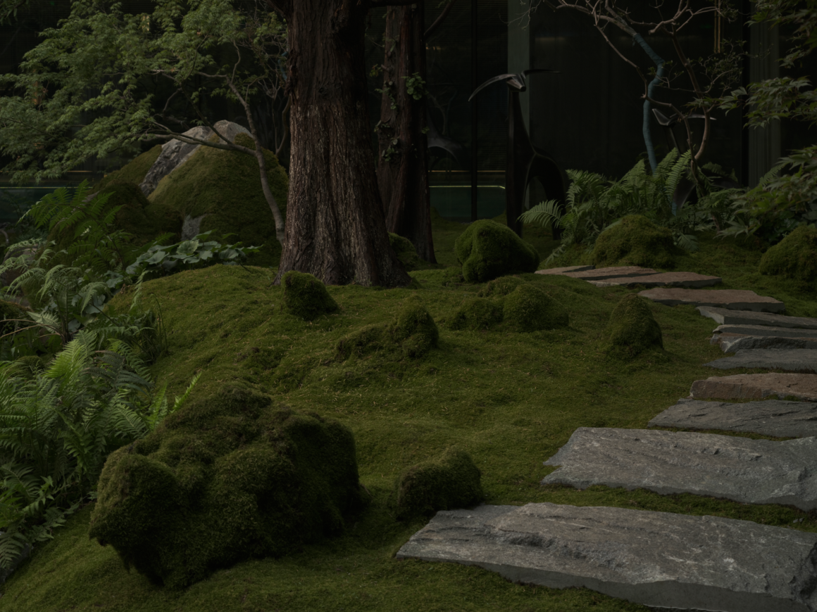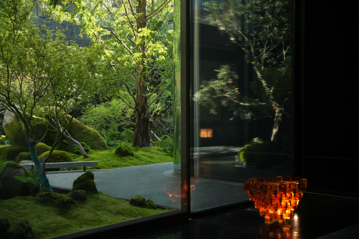 Nine ancient cedar trees grow vertically, extending from the ground floor into the garden, instantly creating the feeling of being halfway up a mountain. A sense of tranquility and mountain dwelling becomes the underlying tone of the inner layers. Beneath the cedars, dense moss grows freely in the moist mountain air, clinging to clusters of rocks that appear to have tumbled down from the mountain, embedding themselves deeply into the earth over years of accumulation.