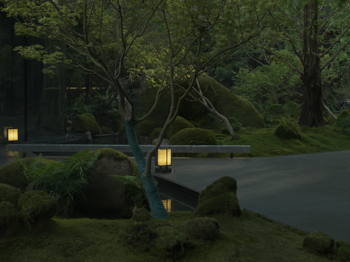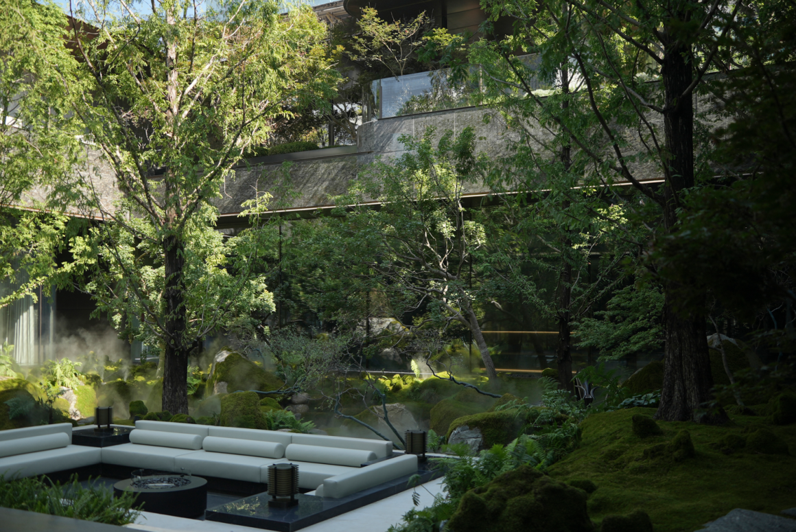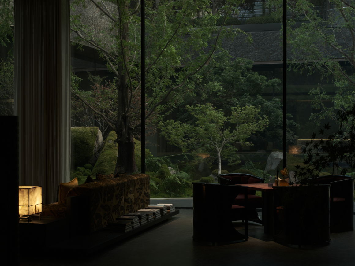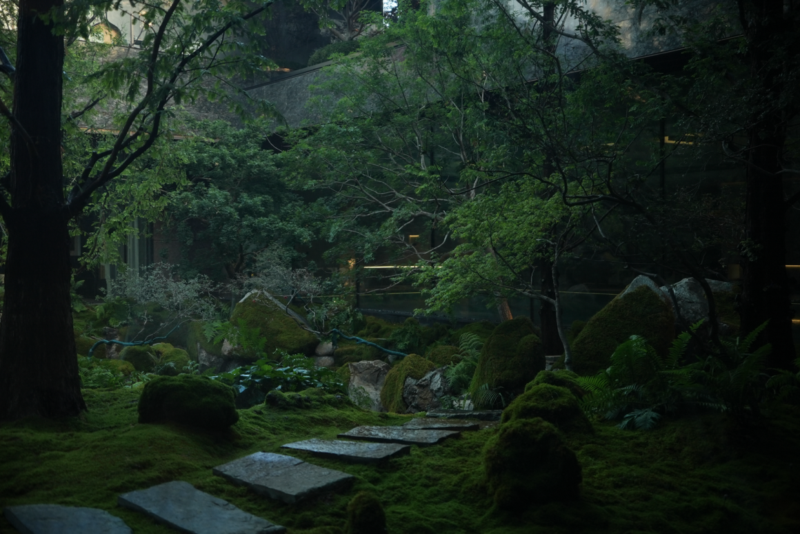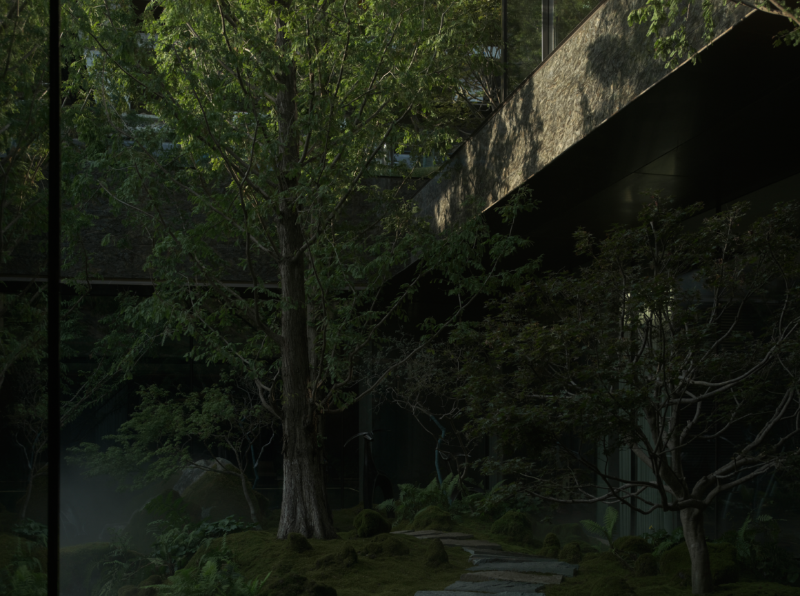 Nine ancient cedar trees grow vertically, extending from the ground floor into the garden, instantly creating the feeling of being halfway up a mountain. A sense of tranquility and mountain dwelling becomes the underlying tone of the inner layers. Beneath the cedars, dense moss grows freely in the moist mountain air, clinging to clusters of rocks that appear to have tumbled down from the mountain, embedding themselves deeply into the earth over years of accumulation.