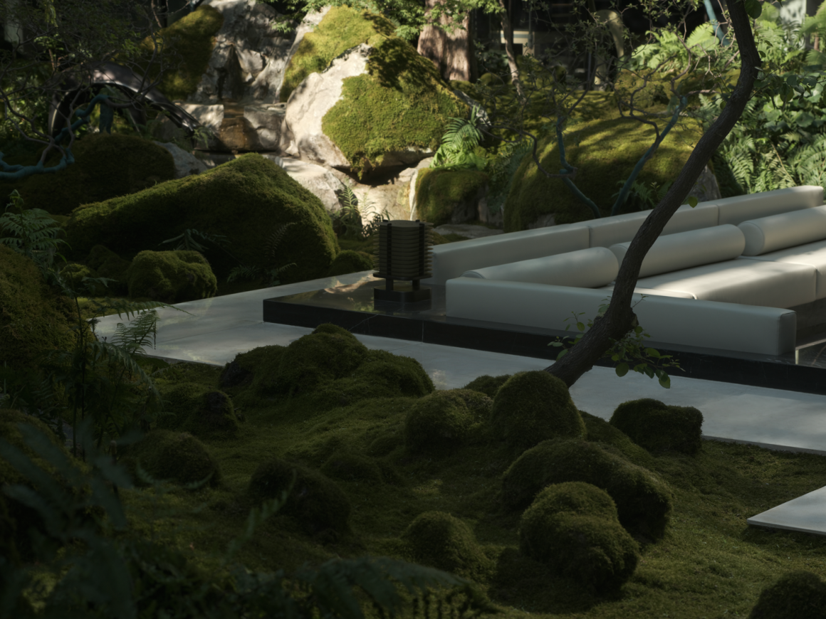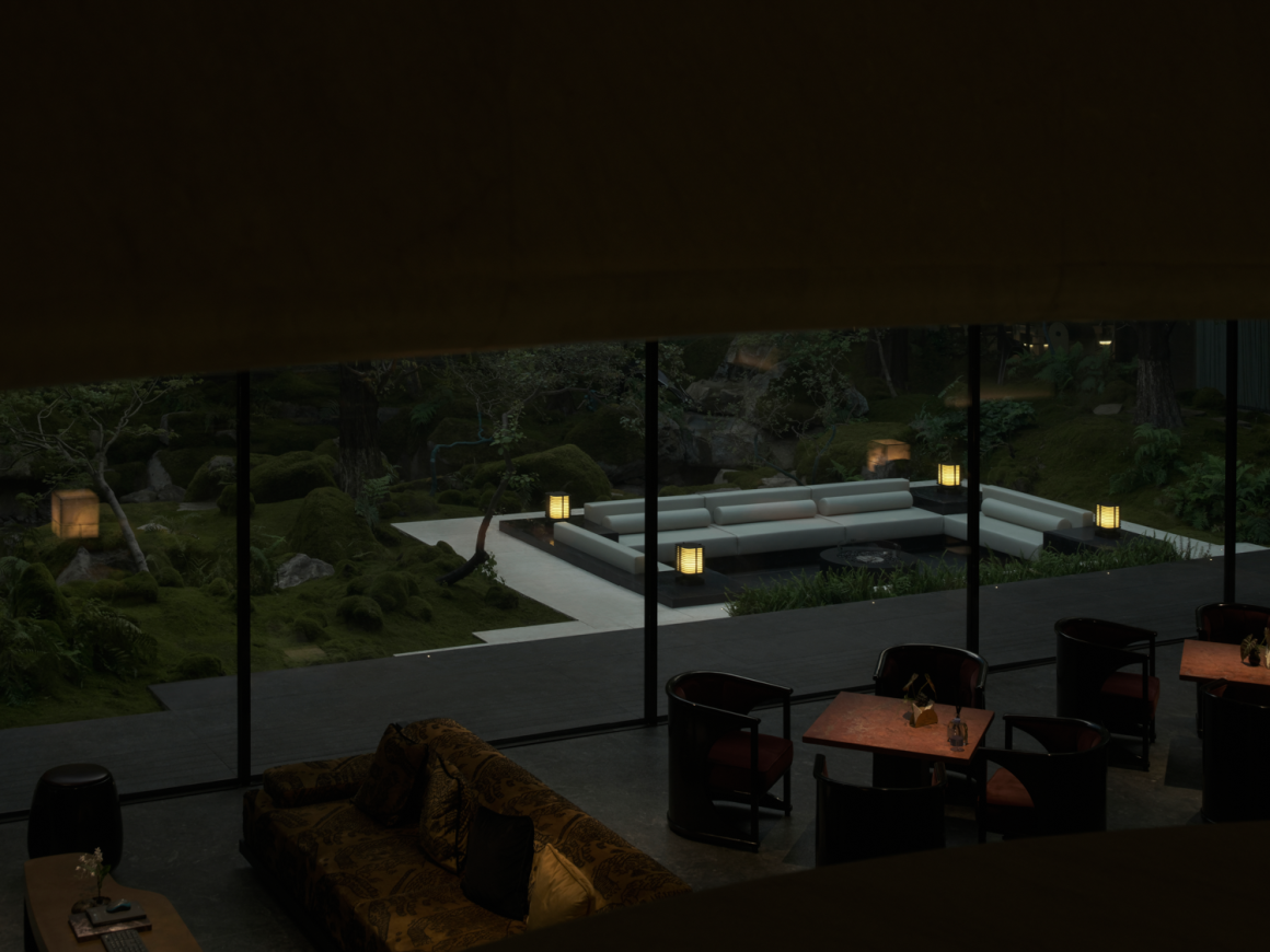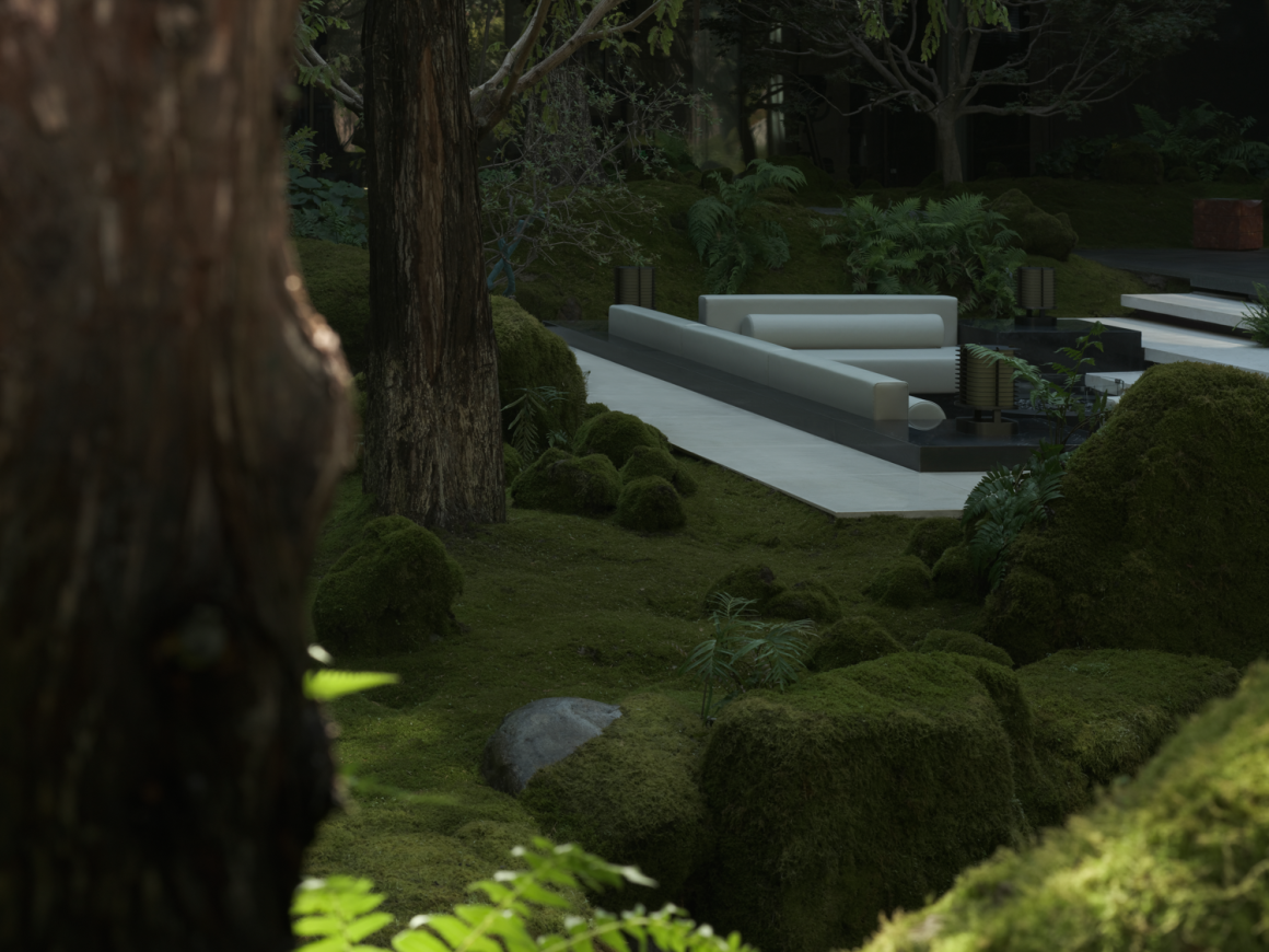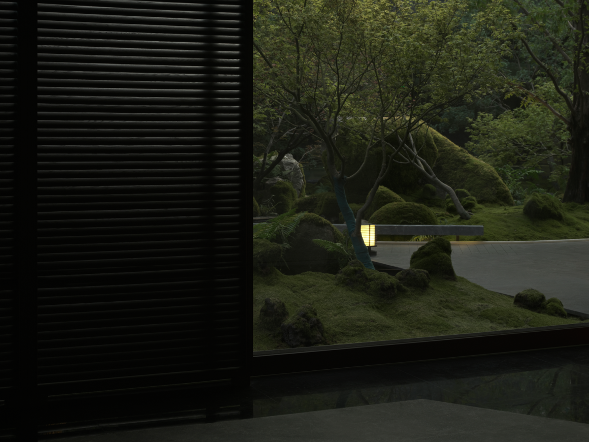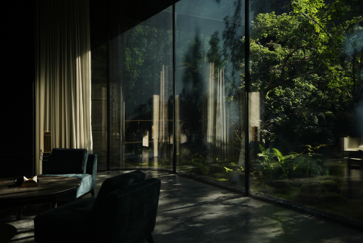 Nine ancient cedar trees grow vertically, extending from the ground floor into the garden, instantly creating the feeling of being halfway up a mountain. A sense of tranquility and mountain dwelling becomes the underlying tone of the inner layers. Beneath the cedars, dense moss grows freely in the moist mountain air, clinging to clusters of rocks that appear to have tumbled down from the mountain, embedding themselves deeply into the earth over years of accumulation.