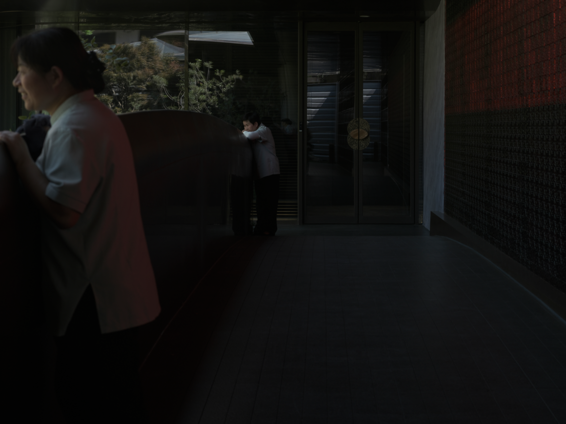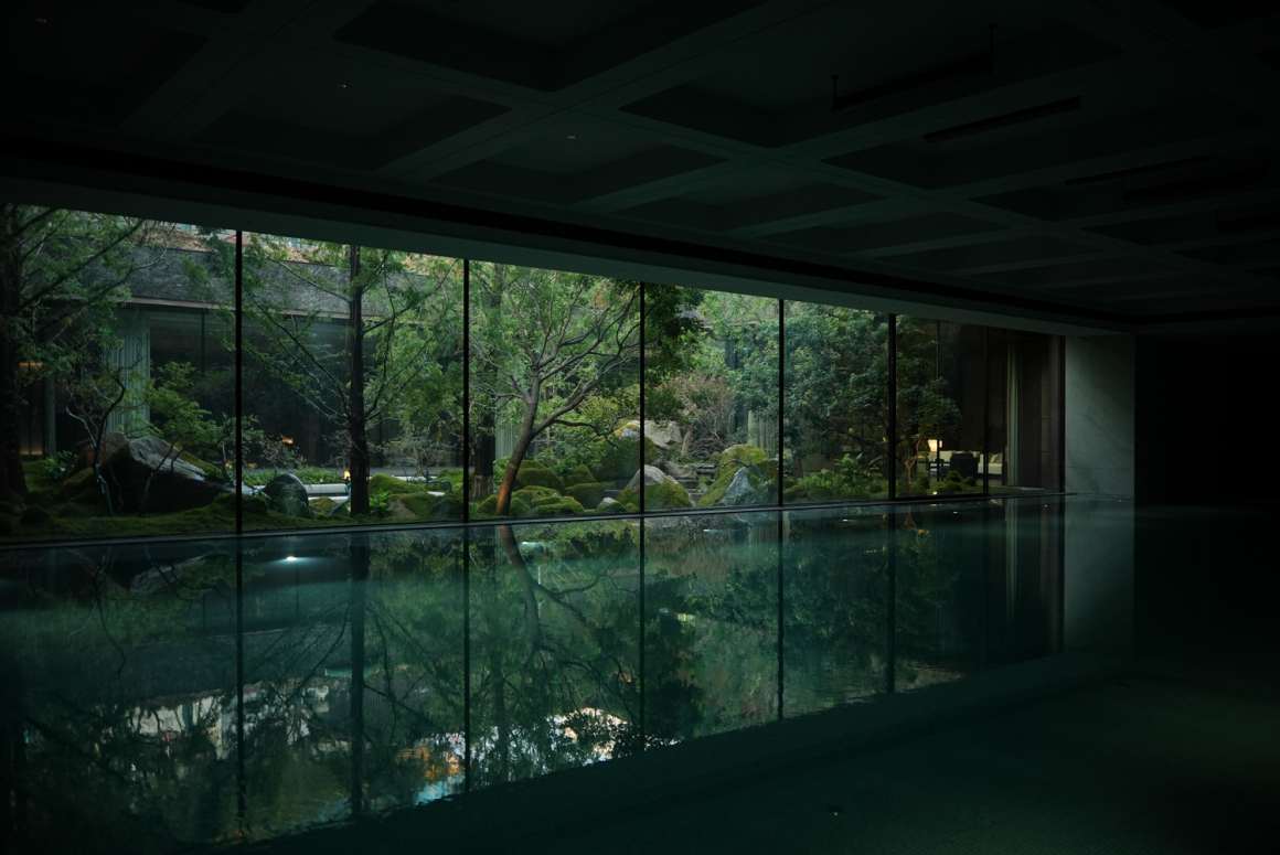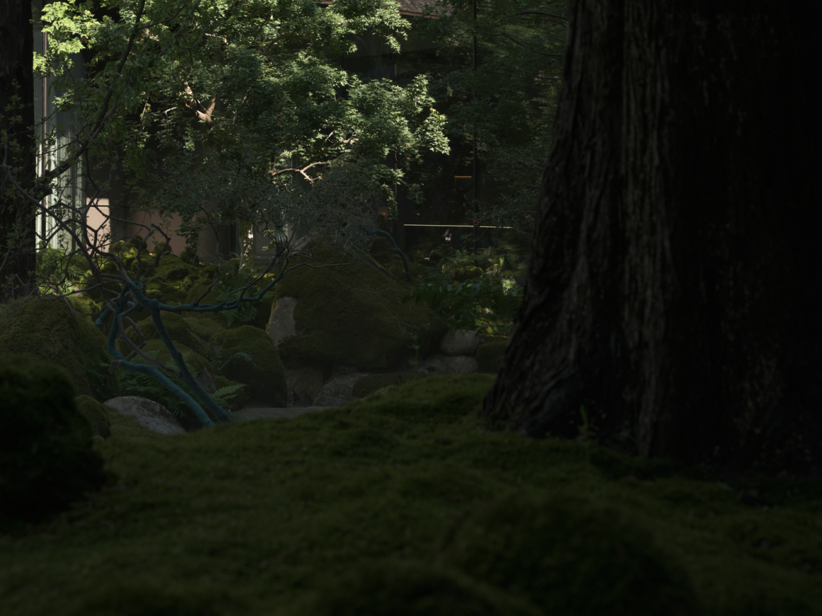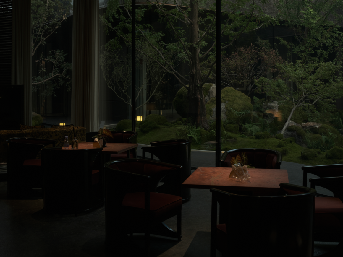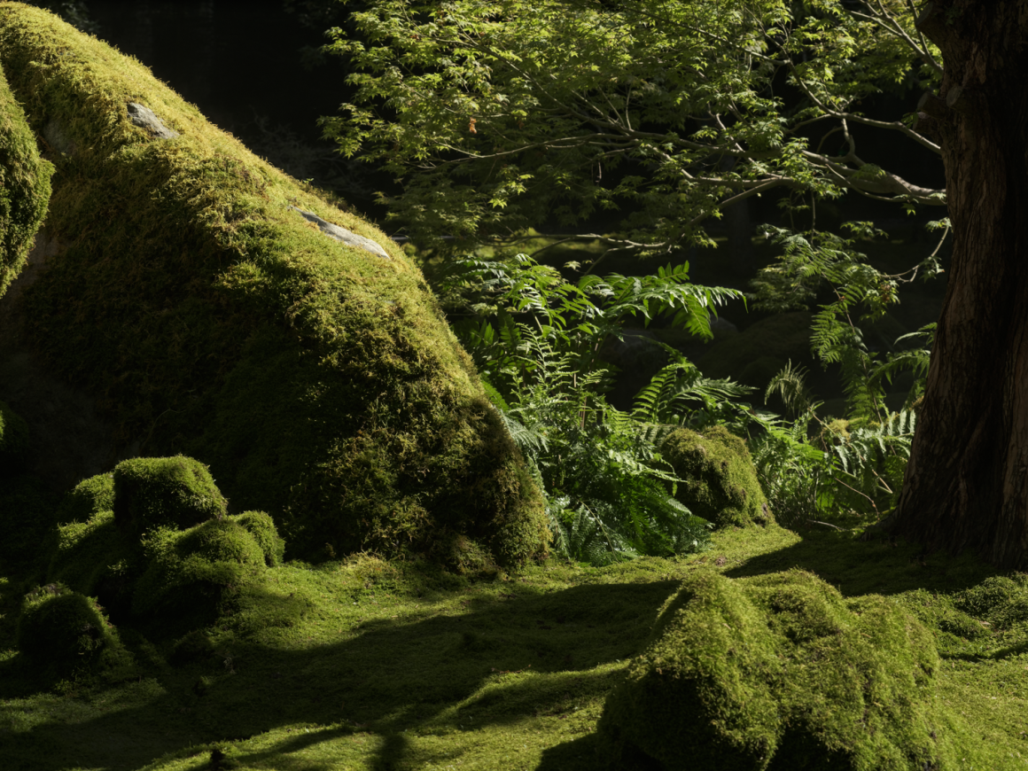 Nine ancient cedar trees grow vertically, extending from the ground floor into the garden, instantly creating the feeling of being halfway up a mountain. A sense of tranquility and mountain dwelling becomes the underlying tone of the inner layers. Beneath the cedars, dense moss grows freely in the moist mountain air, clinging to clusters of rocks that appear to have tumbled down from the mountain, embedding themselves deeply into the earth over years of accumulation.