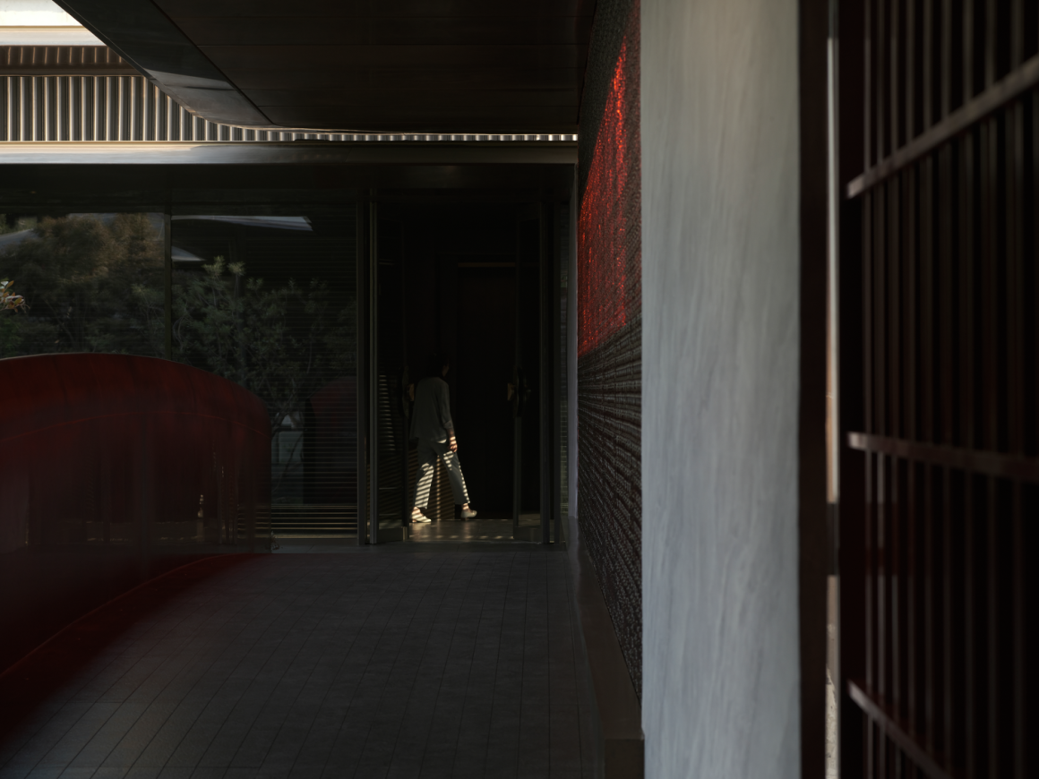 Further along, a rainbow-like bridge connects, its elegant and restrained arc unadorned, yet etched with delicate expressions by the light and shadows cast by the carved lacquer. It is a space of intentional emptiness, where not everything needs to be said.
