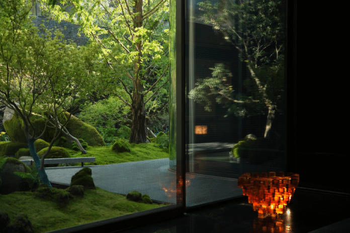 Nine ancient cedar trees grow vertically, extending from the ground floor into the garden, instantly creating the feeling of being halfway up a mountain. A sense of tranquility and mountain dwelling becomes the underlying tone of the inner layers. Beneath the cedars, dense moss grows freely in the moist mountain air, clinging to clusters of rocks that appear to have tumbled down from the mountain, embedding themselves deeply into the earth over years of accumulation.