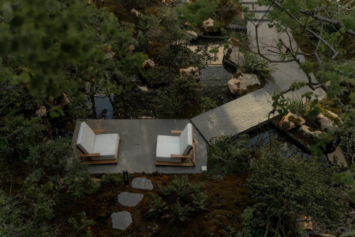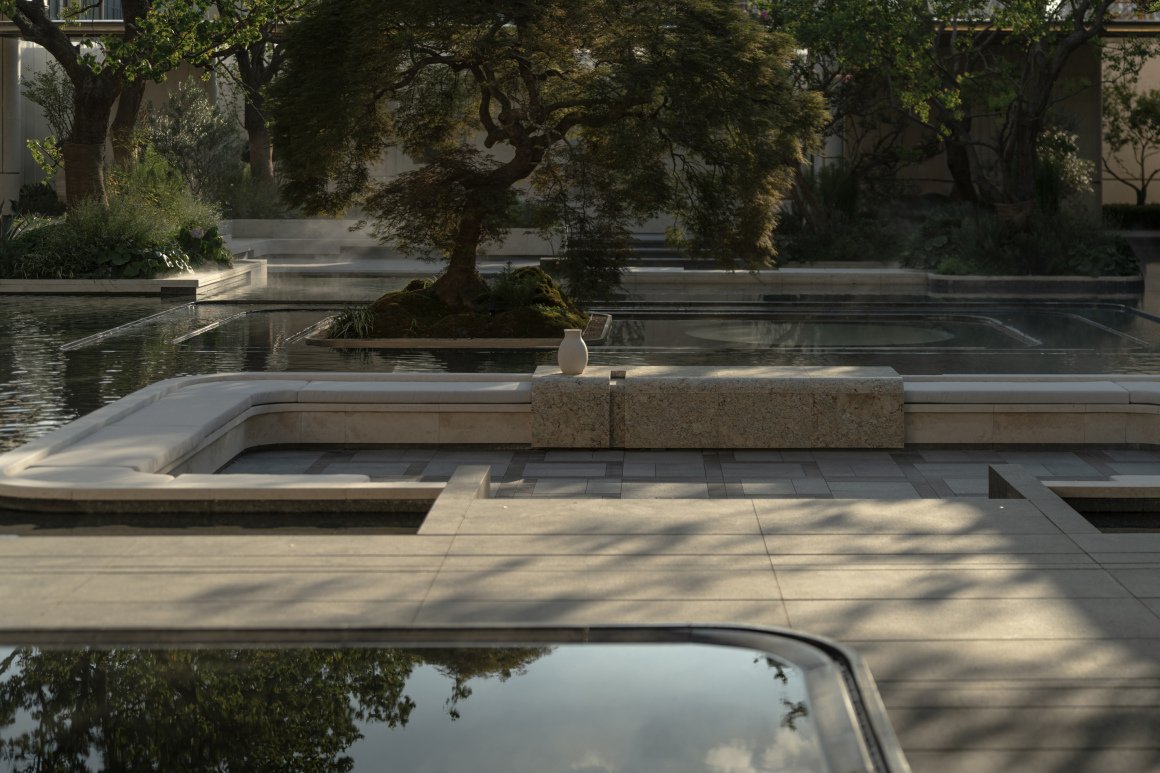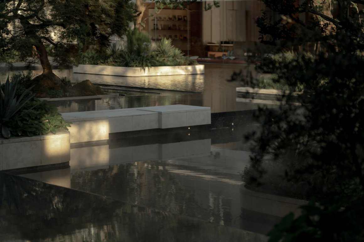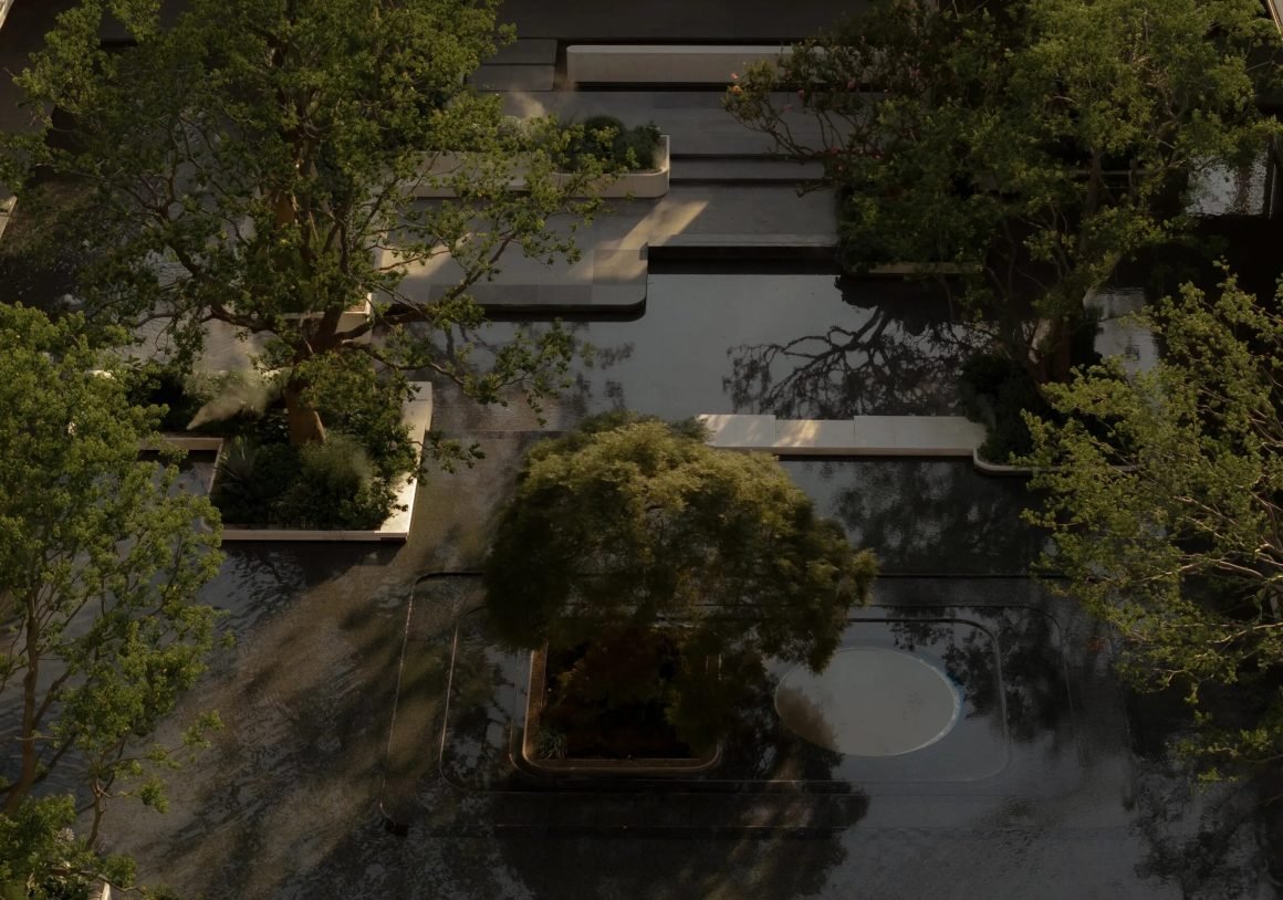 景观汲取苏州园林的精巧的造园特点,在近人尺度上兼顾美学安全与匠心工艺,将自然的斑驳与设计的精致巧妙结合,在咫尺方庭之间营造梦境般的山水意境。