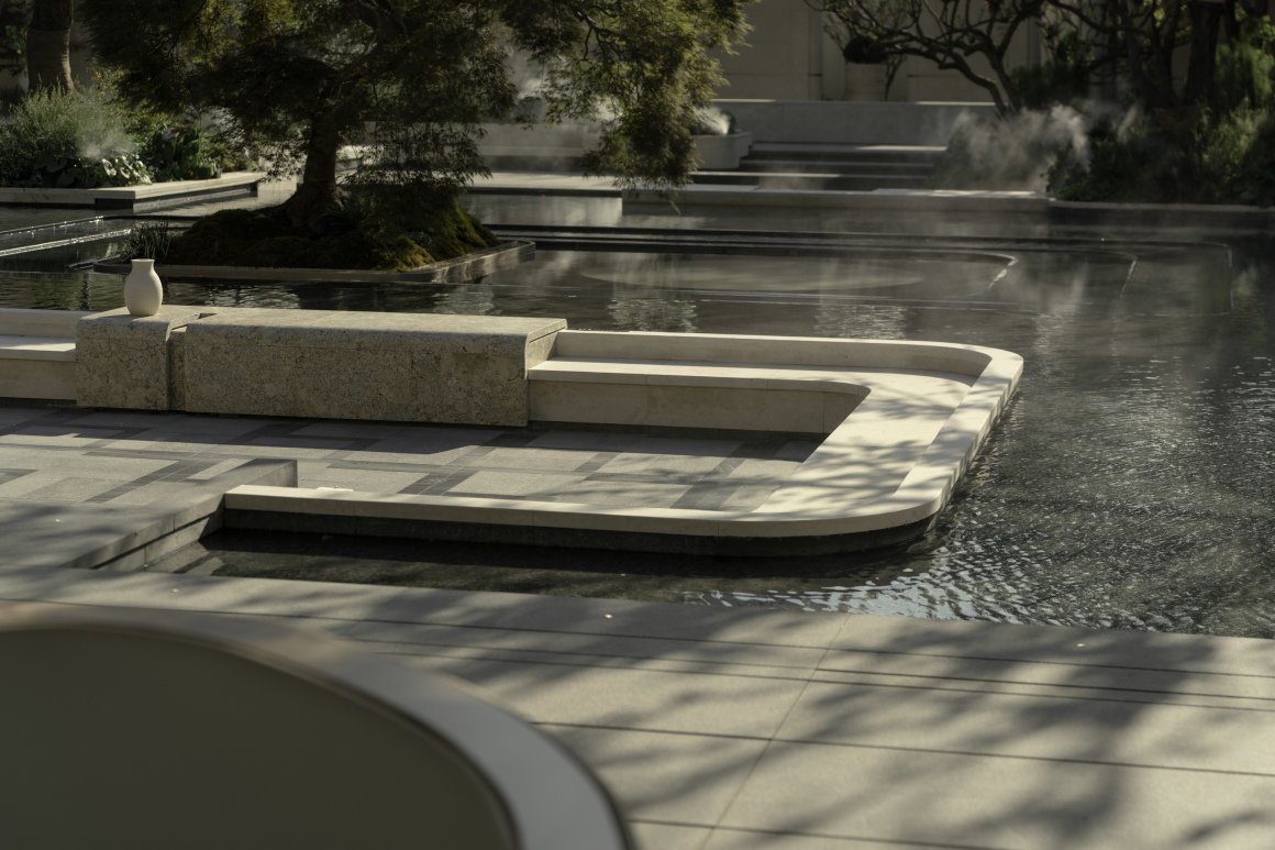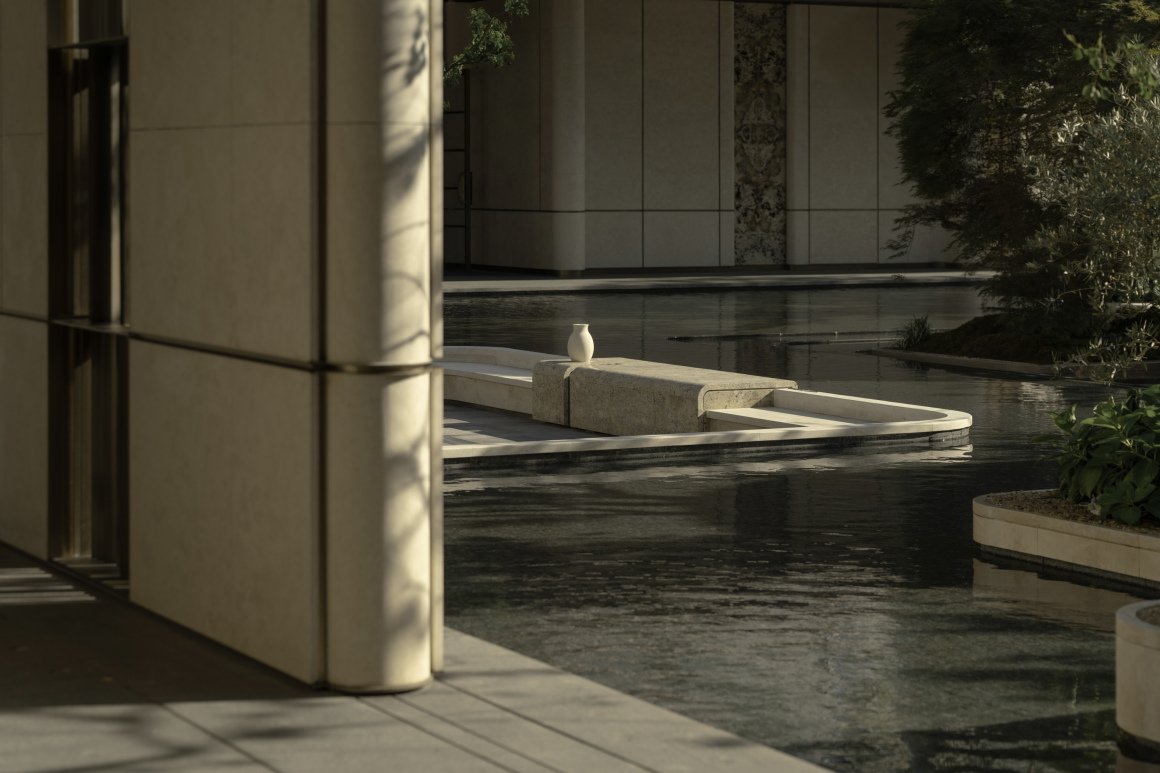 The wall details, with curled edges and recessed joints, along with the bowl-shaped curved water feature, all showcase meticulous craftsmanship. The uniformly coordinated beige tone, paired with the selection of Venato marble—an exquisite stone—exudes a unique style without losing a sense of ceremonial solemnity. Through restrained and elegant forms, it interprets an atmosphere of refined living and enhances the exclusive, custom-made feel worthy of a luxury residence.