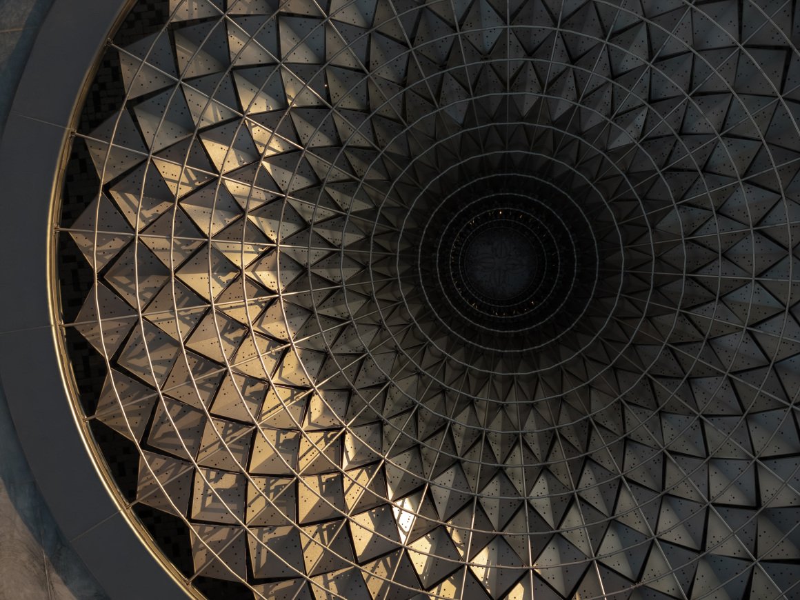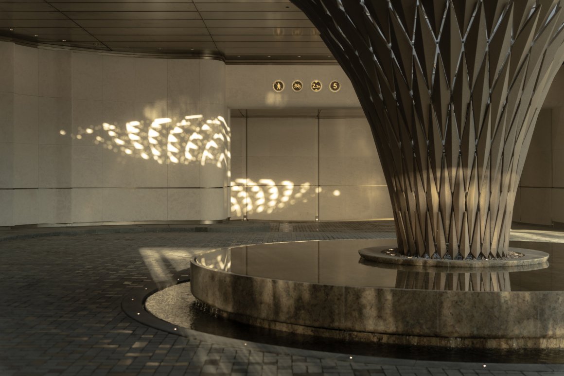 来到入口落客院,首先感受到的是约250米长的超长景观墙界面,以及42m宽、4.8m高的仪式感门厅,入口采用酒店式环岛落客,中心设置寓意「天下四聚」的艺术装置,不仅展现出归家的蕴贵门面和仪式感,还与苏扇工艺打造的黄金池底基座互相辉映,随着光影延时旋转,将归家升华为一段熠熠生辉的时光之旅。