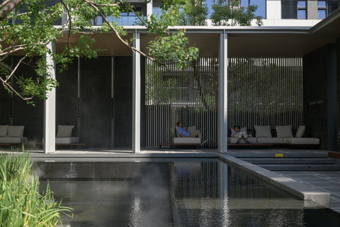 The L-shaped layout of the leisure area alleviates the sense of oppression from the building facing the main entrance. Oriented toward the expansive landscape vista, the bench seating area is thoughtfully positioned behind a scrim wall—a subtle design gesture that envelops visitors in a harmonious connection with nature, immersing them in a serene and elegant living experience.