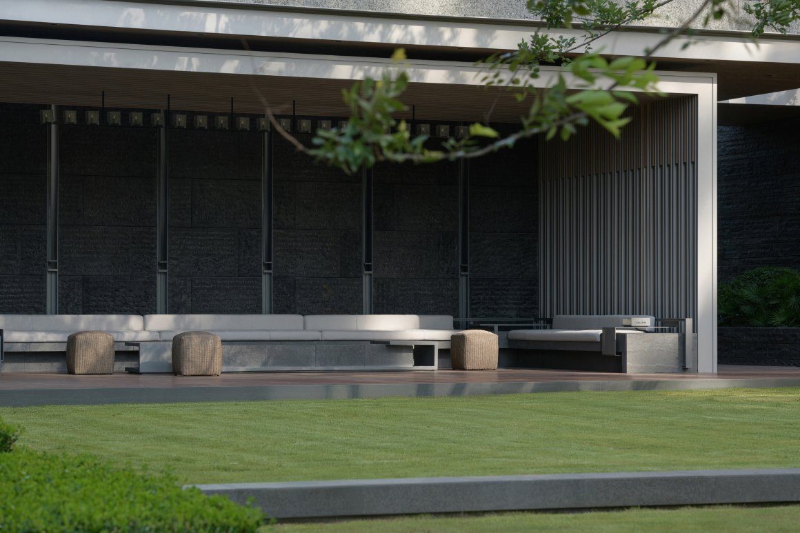 景观会客厅设置在狭长宅间的黄金分割点上,并对场地做架空抬高处理。构架的主体色彩回归纯粹的高级灰,银色的铝板与黑色毛面石材将构架的色彩关系交还给光影。