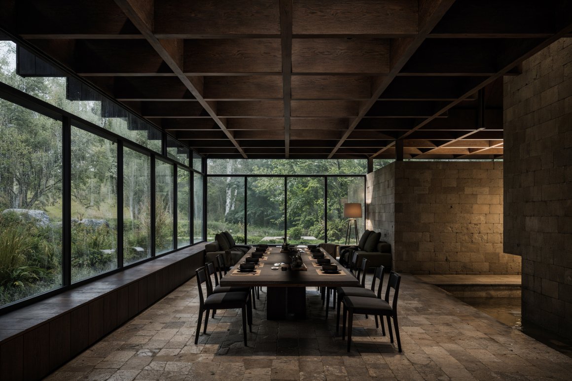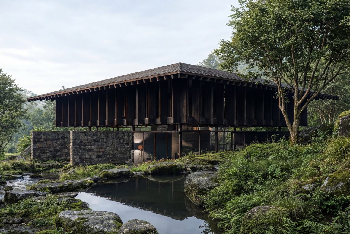 Above the stone base, a wooden structure is carefully assembled, honoring the tradition of Japanese carpentry and its precise systems of joinery. Here, stone gives way to wood as a living material, marking a transition from permanence to intimacy. Sleeping and bathing occur within this timber structure, where warmth, tactility, and craftsmanship define the most per-sonal moments of inhabitation, reinforcing a close relationship between body, material, and space. The roof, supported entirely by the central core, takes the form of a four pitched wooden structure clad in ceramic tiles. More than a protective element, it becomes an instrument for engaging with Yakushima’s climate. Rain is received, guided along its slopes, and released gently as sound, allowing water to be perceived not as an inconvenience, but as an essential sensory layer of the architecture. Rather than seeking visual prominence, the project embraces restraint. Through stone, wood, water, and light, it proposes an architecture that does not compete with its surroundings, but quietly belongs to them an inhabitable pause within the forest, shaped by time, weather, and human presence.