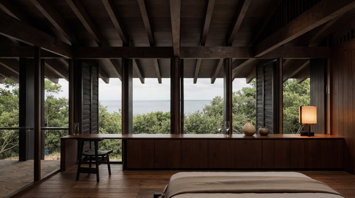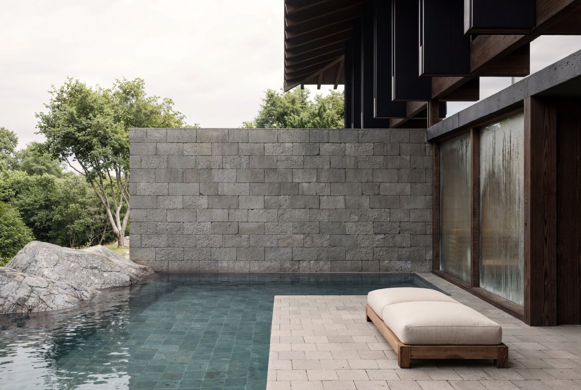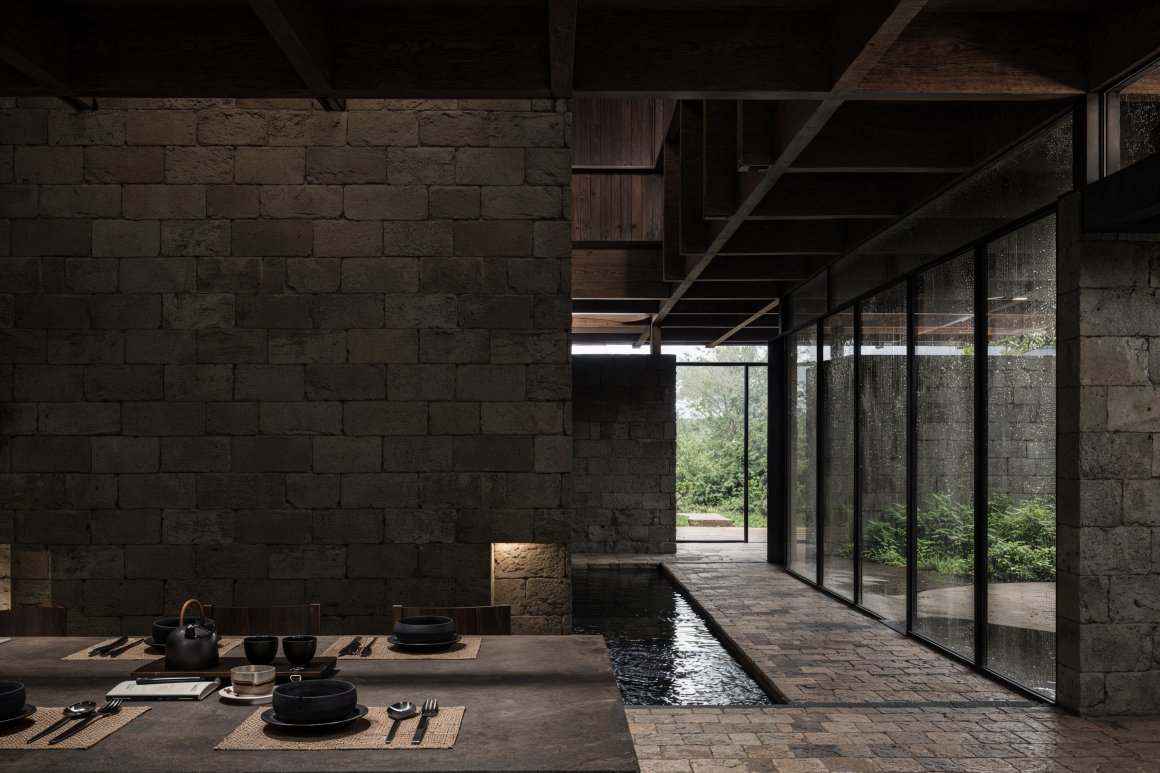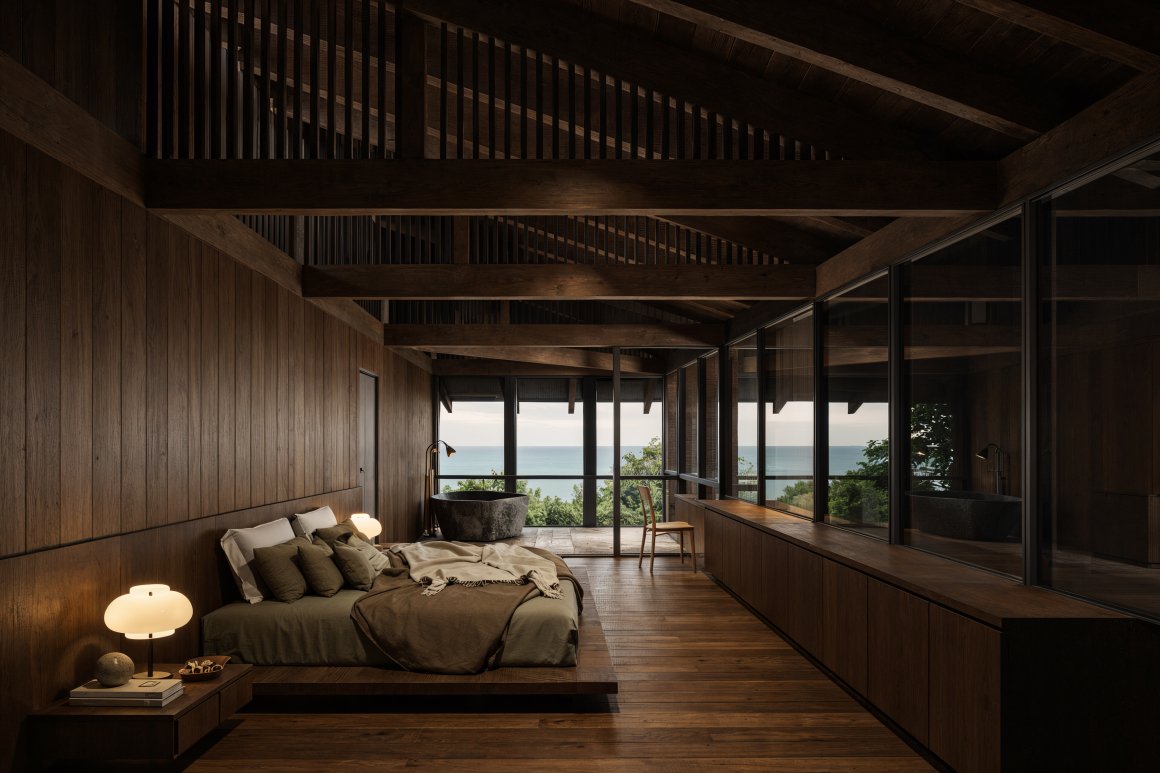 在石质基座之上,精心搭建起一座木质结构,致敬日本木工传统及其精准的榫卯工艺。在这里,石头让位于木材,作为有生命的材料,标志着从永恒到亲密的过渡。睡眠和沐浴都在这座木结构中进行,温暖、触感和工艺定义了居住中最私密的时刻,强化了身体、材料与空间之间的紧密联系。屋顶完全由中央核心支撑,呈四坡木结构,覆盖着陶瓦。它不仅是保护性元素,更成为与屋久岛气候互动的工具。雨水被承接,沿着坡面流淌,缓缓释放出声响,让水不再被视为一种不便,而是建筑中不可或缺的感官层次。该项目不追求视觉上的突出,而是选择克制。通过石头、木材、水和光,它提出了一种不与周围环境竞争,而是悄然融入其中的建筑,成为森林中一处可居住的停顿,由时间、天气和人的存在塑造而成。
