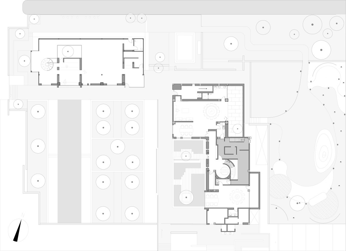 步入场地,建筑与景观在遵循原状布局的状态下重新设计。彼此间僵硬的边界被打破,让建筑融于自然,增强室内外空间的对话和互动,是我们的设计关键词。我们将场地空间的梳理分为两块。前场,即入口处的开阔景观,作为建筑外立面的自然延伸,更注重观赏性。层层递进的平台和投射在中央的水景,通过对称的设计手法,营造出简约的仪式感,烘托了整个项目的环境基调。后场则被赋予了更多的活动空间,我们希望这里成为多样化的活动与事件的发生地。北侧面向河道和密林的场地设有沿河吧台,东侧小树林旁边则开辟出一小块方形木质平台,为小型团队或家庭聚会提供了理想的场所。场地之中,几棵大树挺拔而立,为这片空间谱写了自然的重音。而在场地东北角,还保留有一片未经建材污染的田地,我们让其回归农田种植本用,延续原生态的有机生活方式。