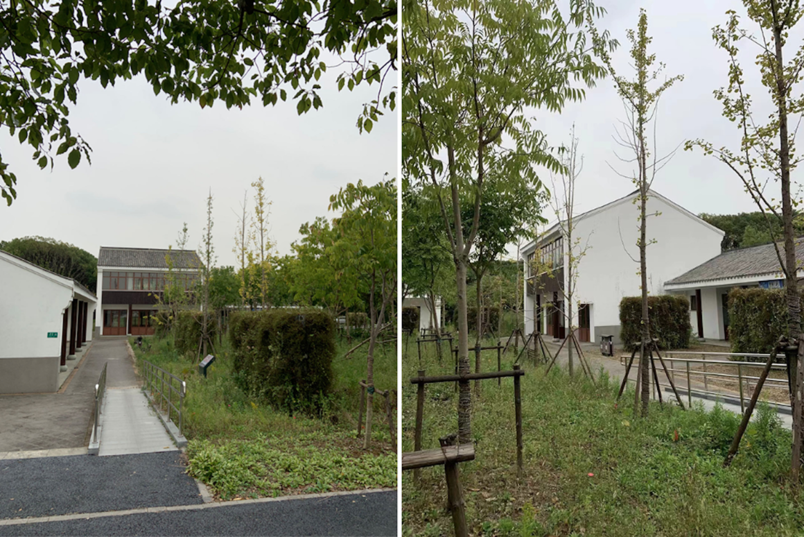 这里原本是浦江郊野公园配套浇灌植物的设备用房,路边的景观也显着萧瑟和疲态。我们重新规整了场地边界,用成段的白色围墙定义内与外。这一组隔而不断的片墙,将内部景观与周围环境区隔开,而通过围墙间的缝隙,又可以从外部窥见内侧的气氛。