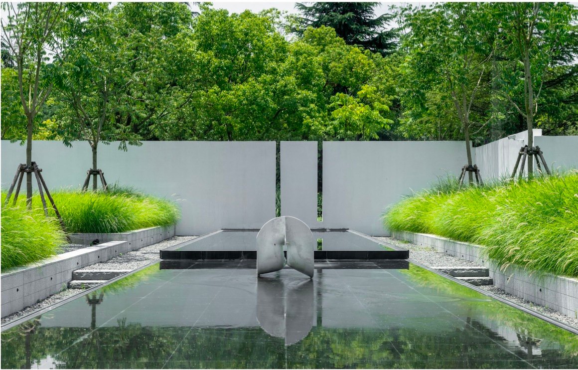 在平台上向北望,远处闵浦大桥高耸的索塔、放射状的拉索与前景起伏的植物轮廓,勾勒出一幅静谧的现代山水画。这幅画随着自然而变化,它永远不会让你感到厌倦。站在平台向南望,俯瞰楼下的仪式感景观,由白色院墙环绕的优美院景,倒映在中央水面,悠然轻摇,能收获一份内观的宁静与治愈感。