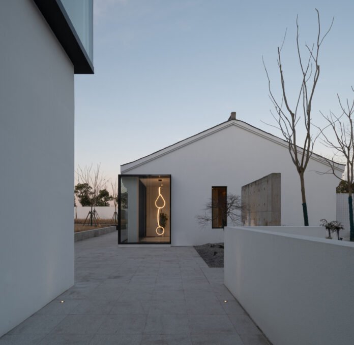 Previously an irrigation facility for Pujiang Countryside Park, the site had grown desolate. FG Studio redefined its boundaries with clean white walls that create separation while allowing glimpses into the interior.