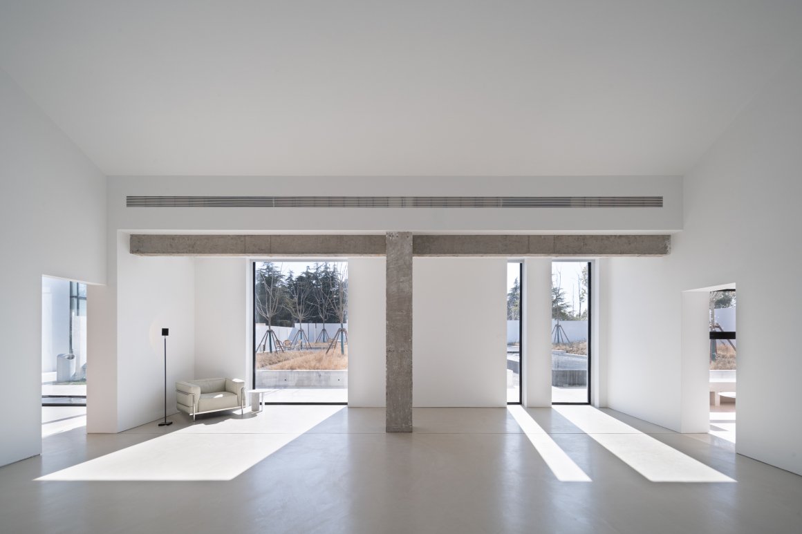 在两栋单层建筑中部,我们新增了竖向的、高两层的白色混凝土盒子,带有大面积落地窗,来打破空间的沉闷感。这个盒子也承担着展厅功能,本身需要通过先进入室内然后抵达。但到了盒子的二层,又是一个完全开放的空间,远眺周围开阔的风景,又完成了一次室内与室外的切换。同时,通过开天窗的设计方式,我们将天光引入,塑造柔和的节奏感,既增加了室内的采光,也让光线在层层新与旧的空间关系中,实现穿越和漫游,将人的空间体验变得更加广阔悠长。