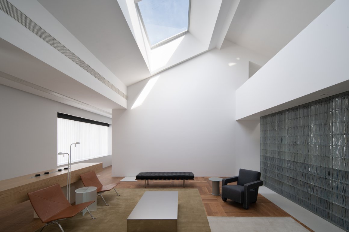 The interiors feature custom-designed furniture and surfaces, including a “design showroom” with patchwork flooring made from project materials. Glass-brick partitions and partial glass flooring enhance spatial fluidity, while experimental furniture prototypes add a personal touch.