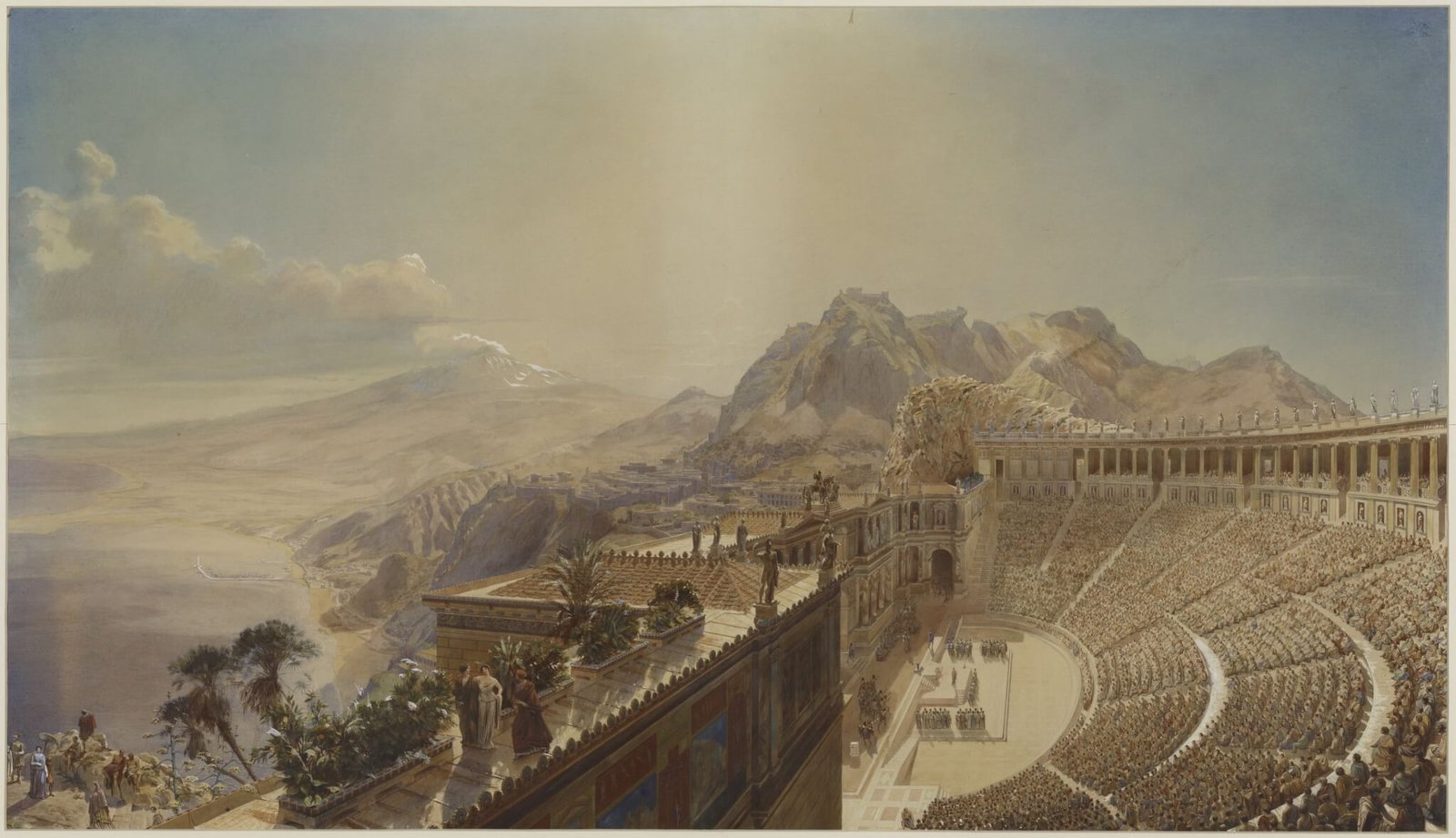 The exhibition begins in the first-floor gallery with his embrace of history painting and antiquity on an early Grand Tour through France and northern Italy. The Bard treatment sets aside his proposal to restore the ancient Greek Theatre of Taormina as the singular expression linking those two countervailing 19th-century beliefs with the Classical ideal. It also stages Viollet-le-Duc’s 1840 painting of the theater as evidence of his mastery of placemaking concepts and equal skill at “painterly” observation.