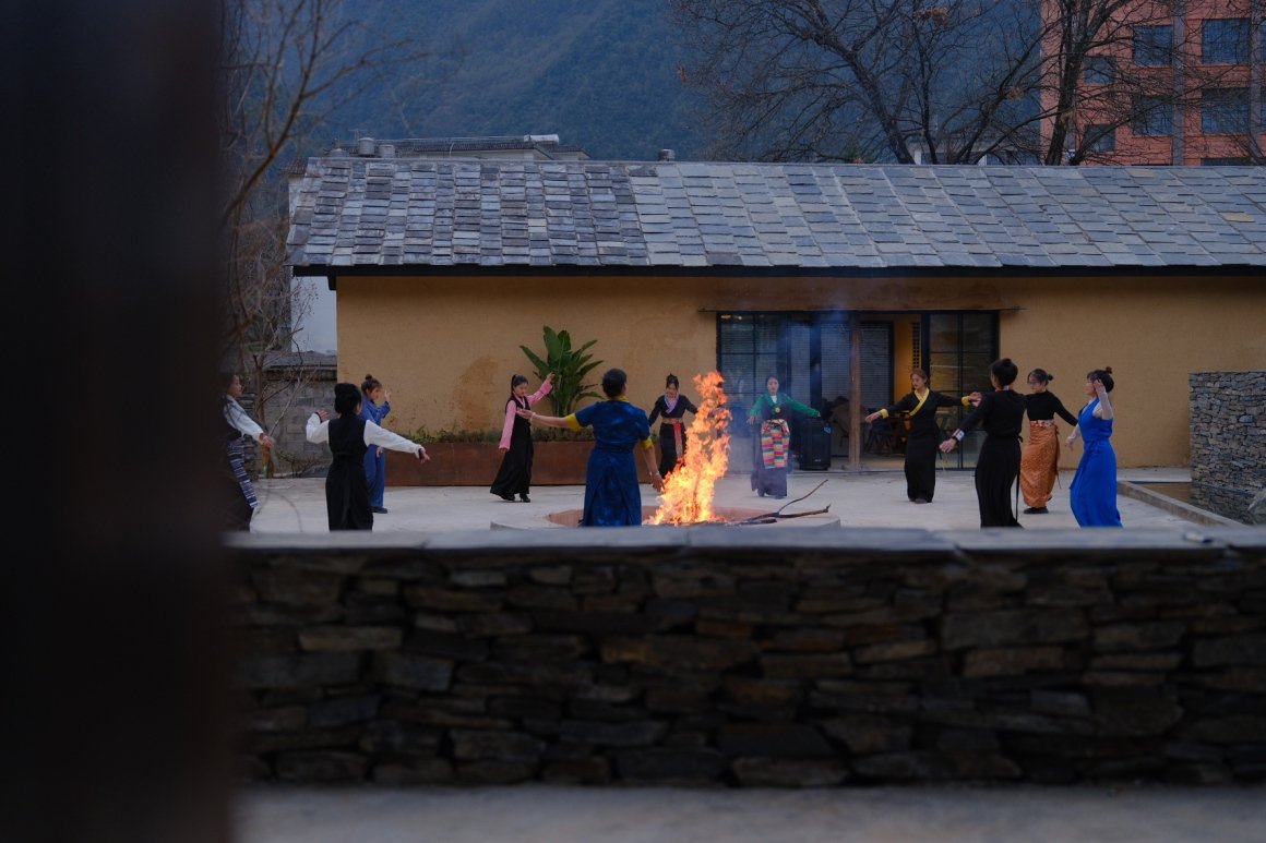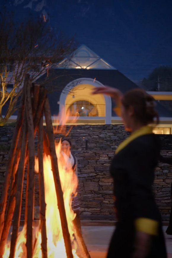 火塘门前是一片露天开敞的区域,入暮时分,太阳隐于大山的身后,所有光辉逐渐收敛,一团篝火在场地的中央被燃起,火焰带来的温度使人与人的交往在这片充满原始野趣的场域产生。