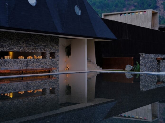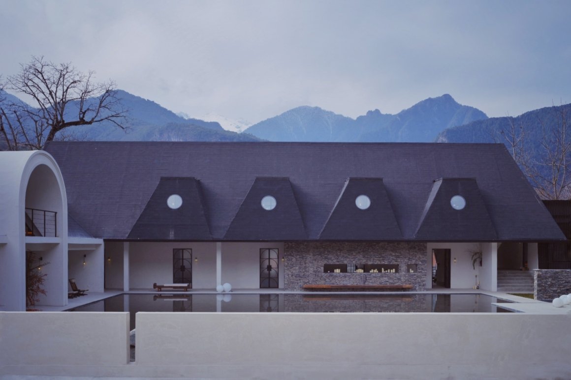 A reflecting pool in front of the main building mirrors the sky, creating symmetrical compositions that appear pure and serene against the mountainous backdrop.