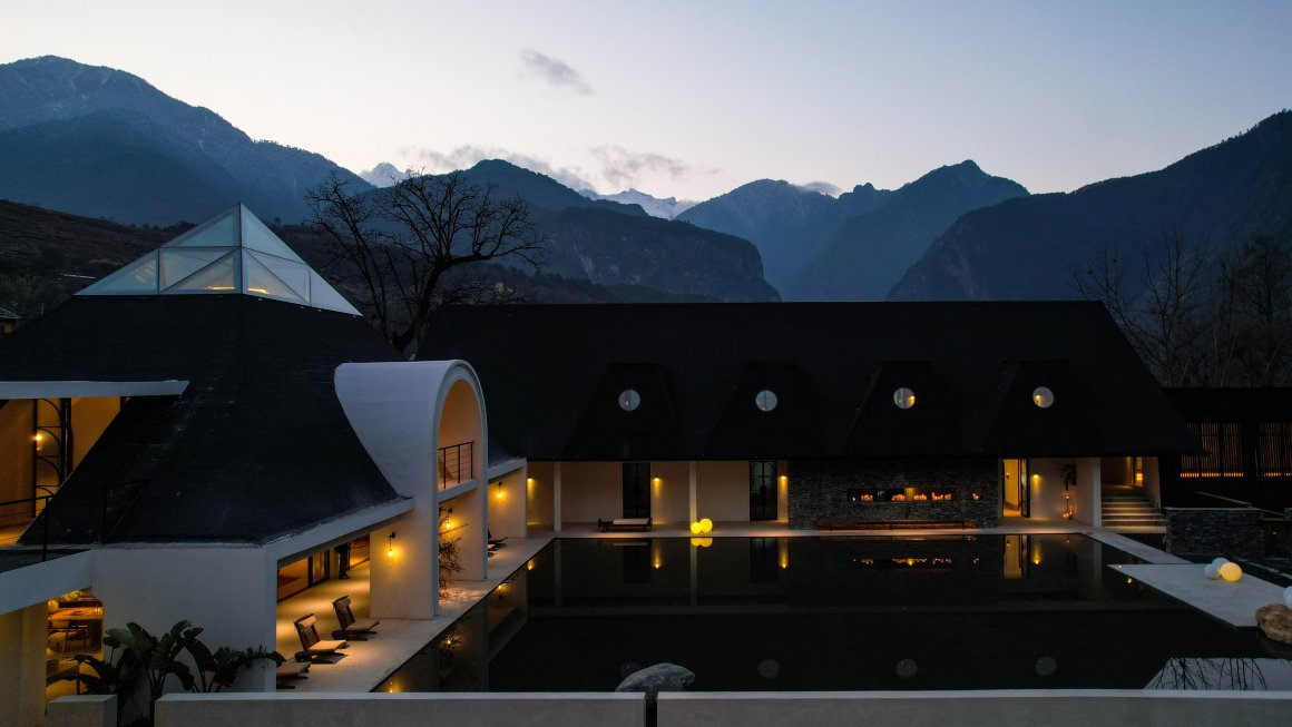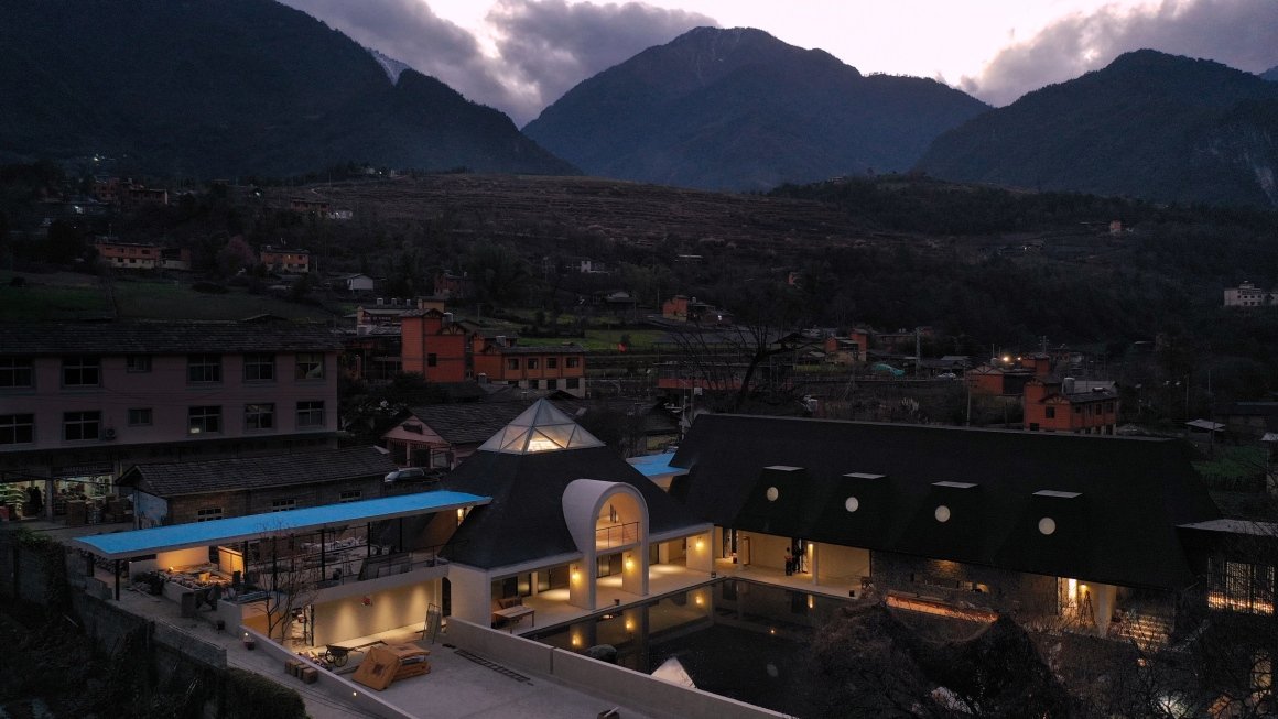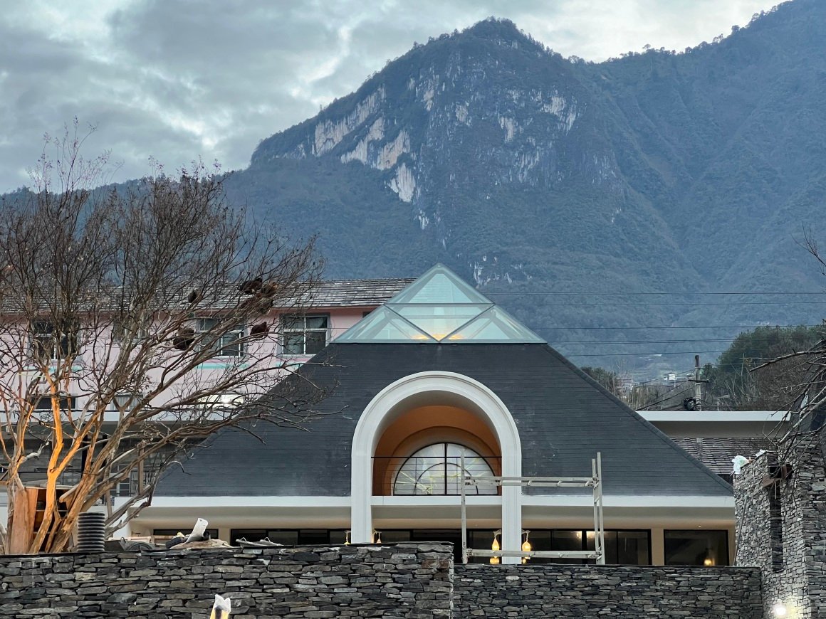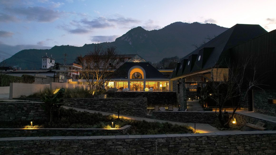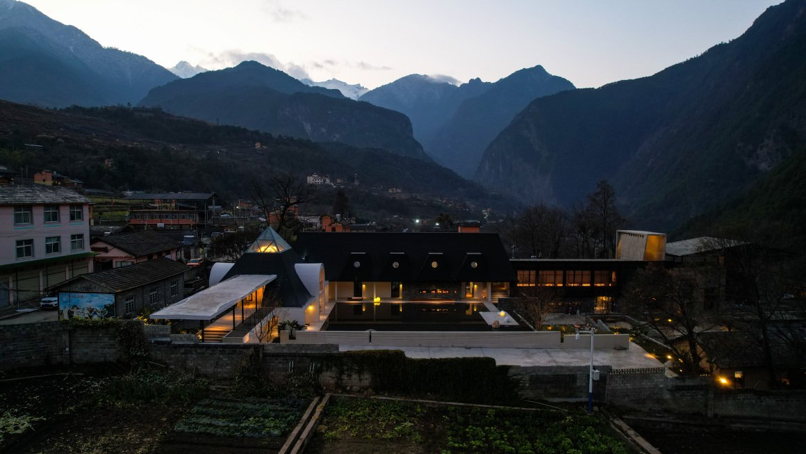 建筑是与自然山川之间产生多维度关系的共合体。建筑外墙与景观挡土墙的材料均就地取材,以表达对大山的敬畏。大自然给予丙中洛独特的矿质馈赠,山石切面如刀削一般平整,运用山石砌筑成面,其独特的肌理也具有强烈的在地性和饱满的视觉张力,如原地生长出来的空间,消除现代建筑与自然的距离感。