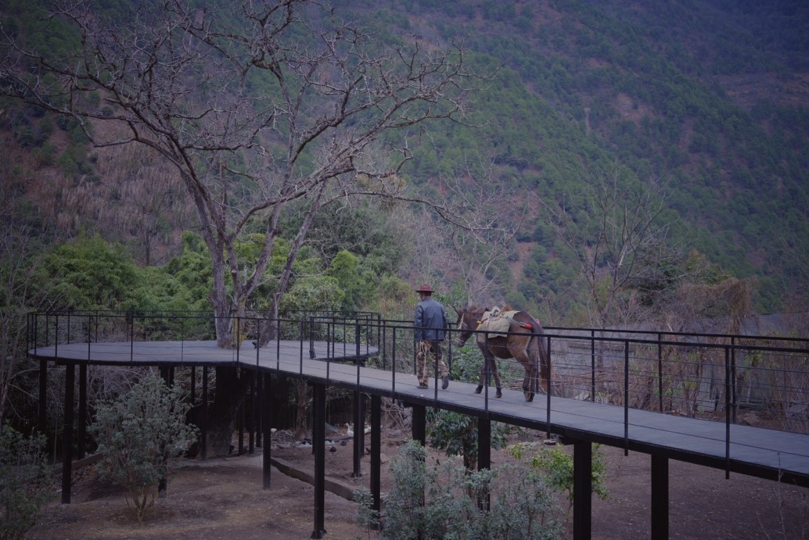 场地内的多棵乔木被悉数保留。它可能不具任何含义,也不代表任何东西,而它却能和丁大妈吟唱的调子一样感染着周遭的一切。我们利用高差关系架设的环形栈道中间夹着一棵老树,它根植于场地中轴之上,与主楼遥相对望,延伸出去的栈道也让人进一步前置与群山相拥。当山间的雾气升腾,抽象且虚无的诗意画面微妙转换,平淡却丰盈,得以寻觅到内心真正的向往。