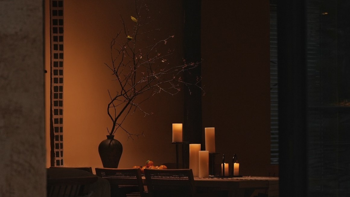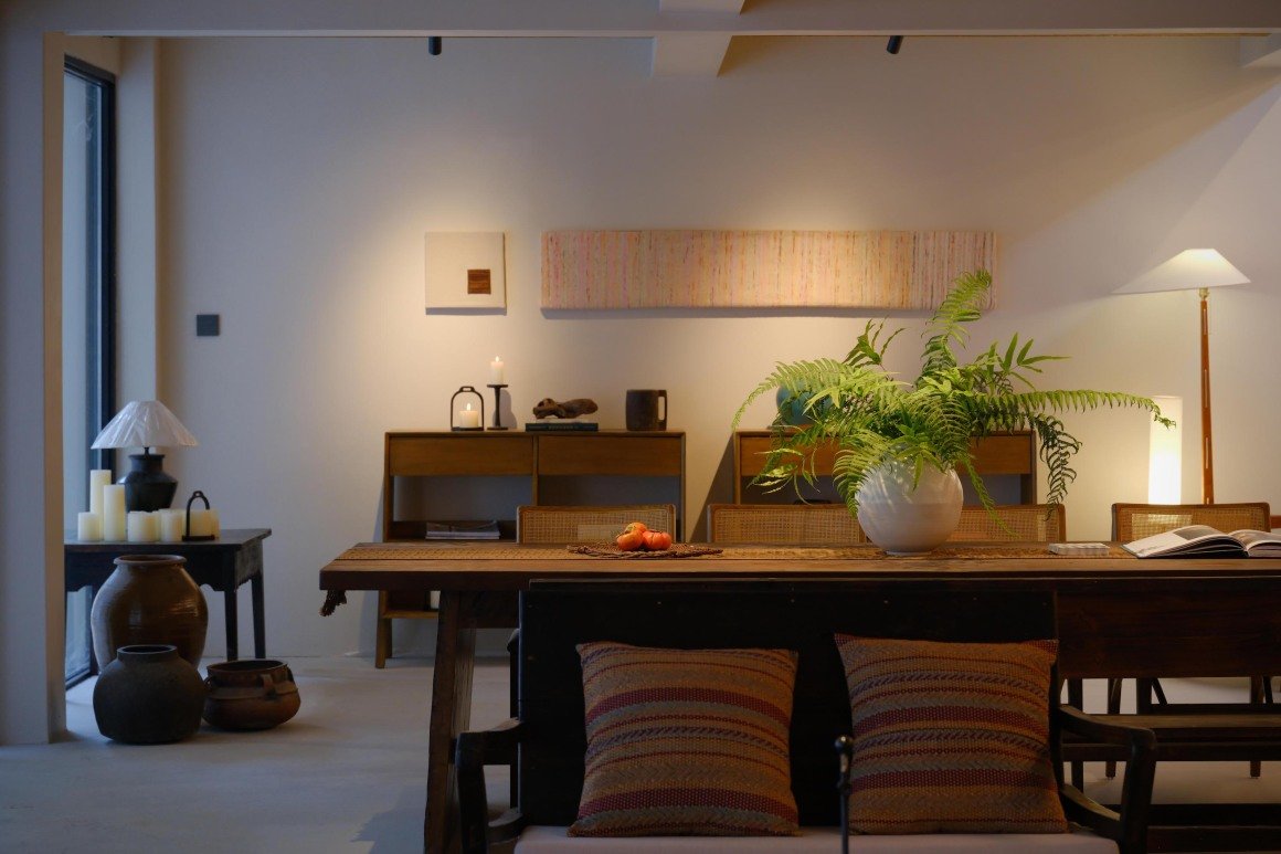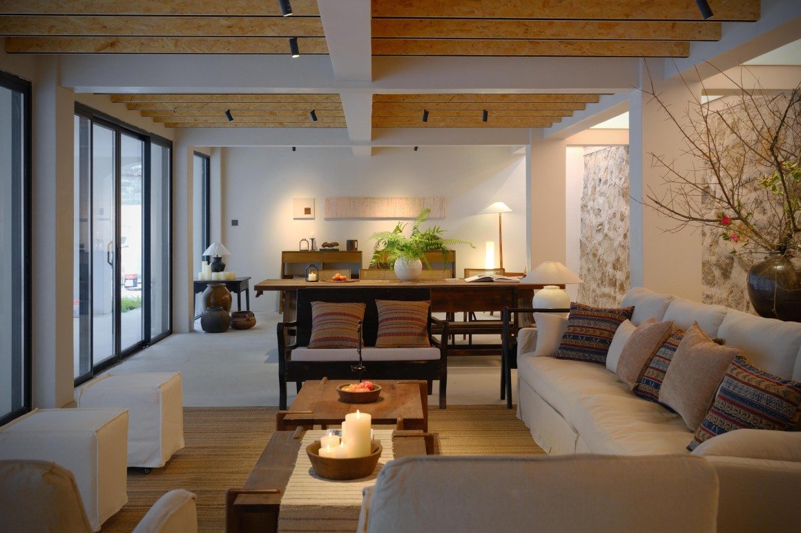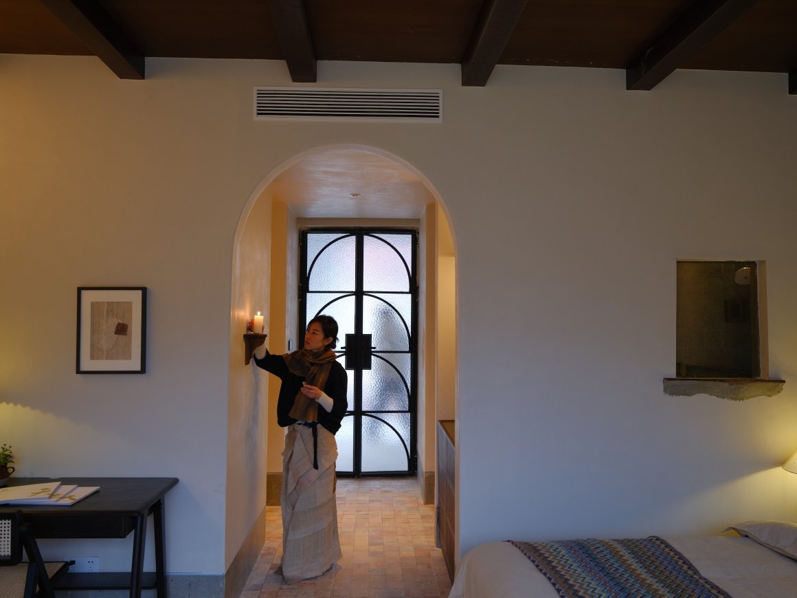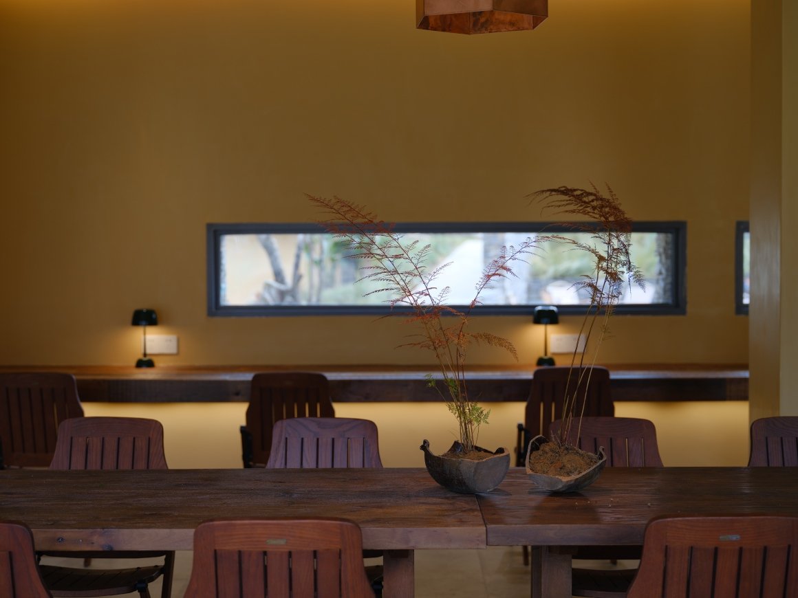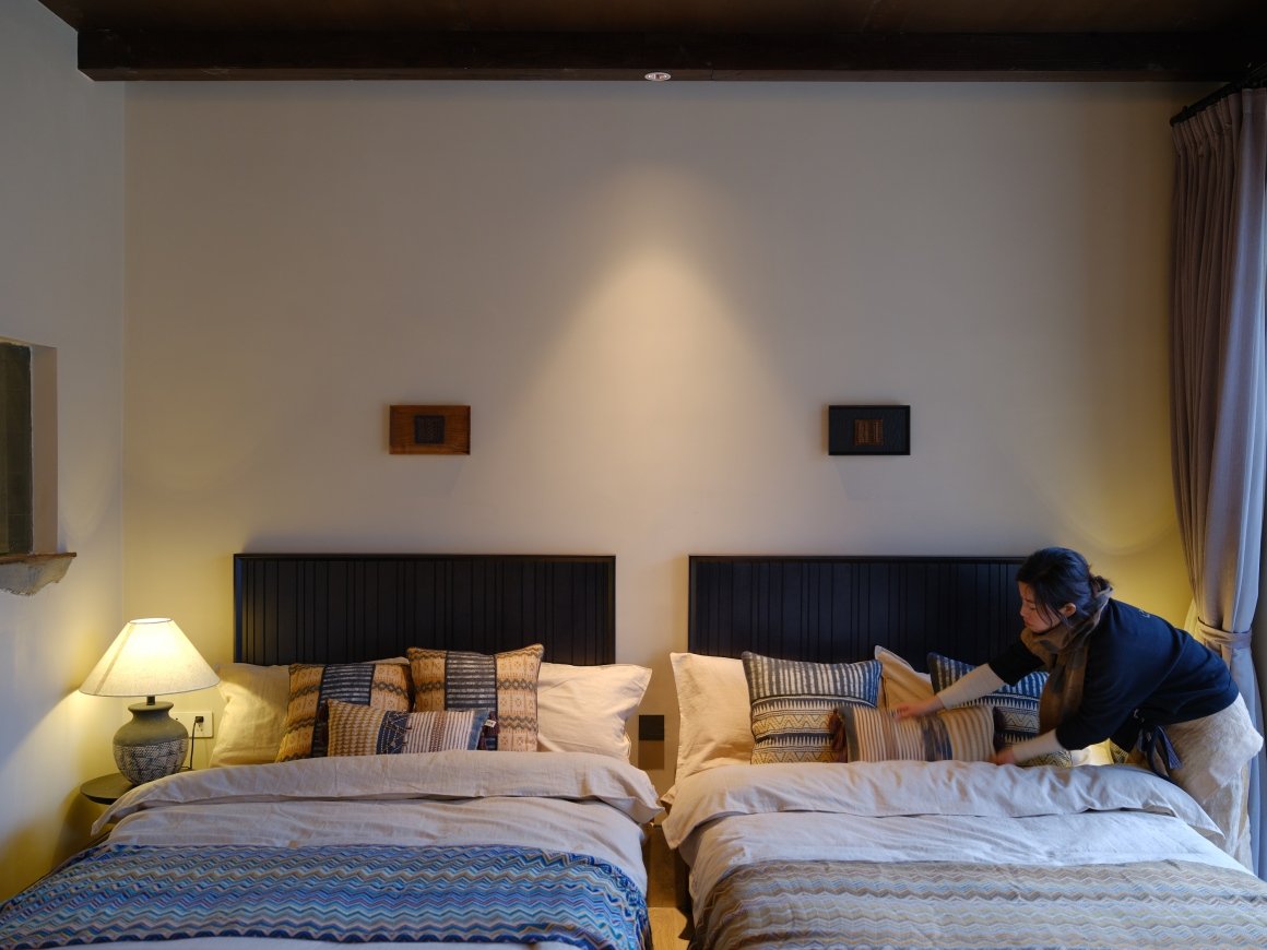 进入歇的室内部分,我们保留了一整面原始建筑的毛石墙,粗矿的质感与充满野趣的家具、饰品相互承接。从当地村民家里回收的带有强烈民族质感的布料被制成艺术装置,重塑的感观形象制造令人沉浸的氛围,影响是悄无声息的。