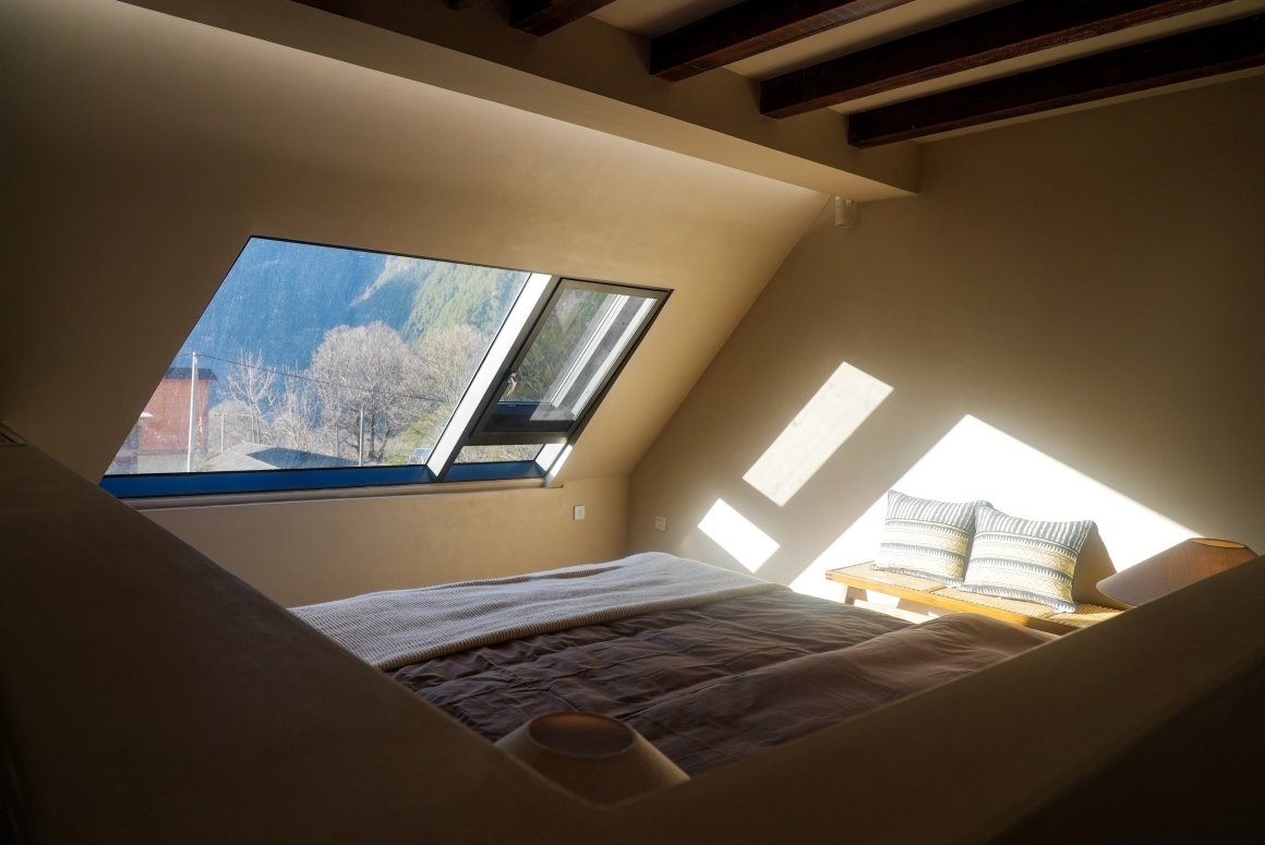 Structural elements become artistic expressions as light and shadow interplay, creating a powerful geometric sequence. The hostel spaces cater to both private stays and short-term, interactive accommodations for young travelers. Shared reading and relaxation areas connect the units, blending interior and exterior scenery. The units feature large open windows inviting the sky and the mountains to infuse with the residents.