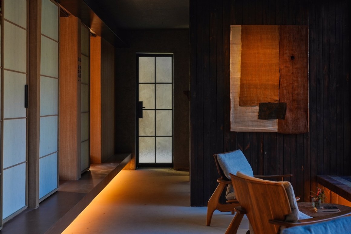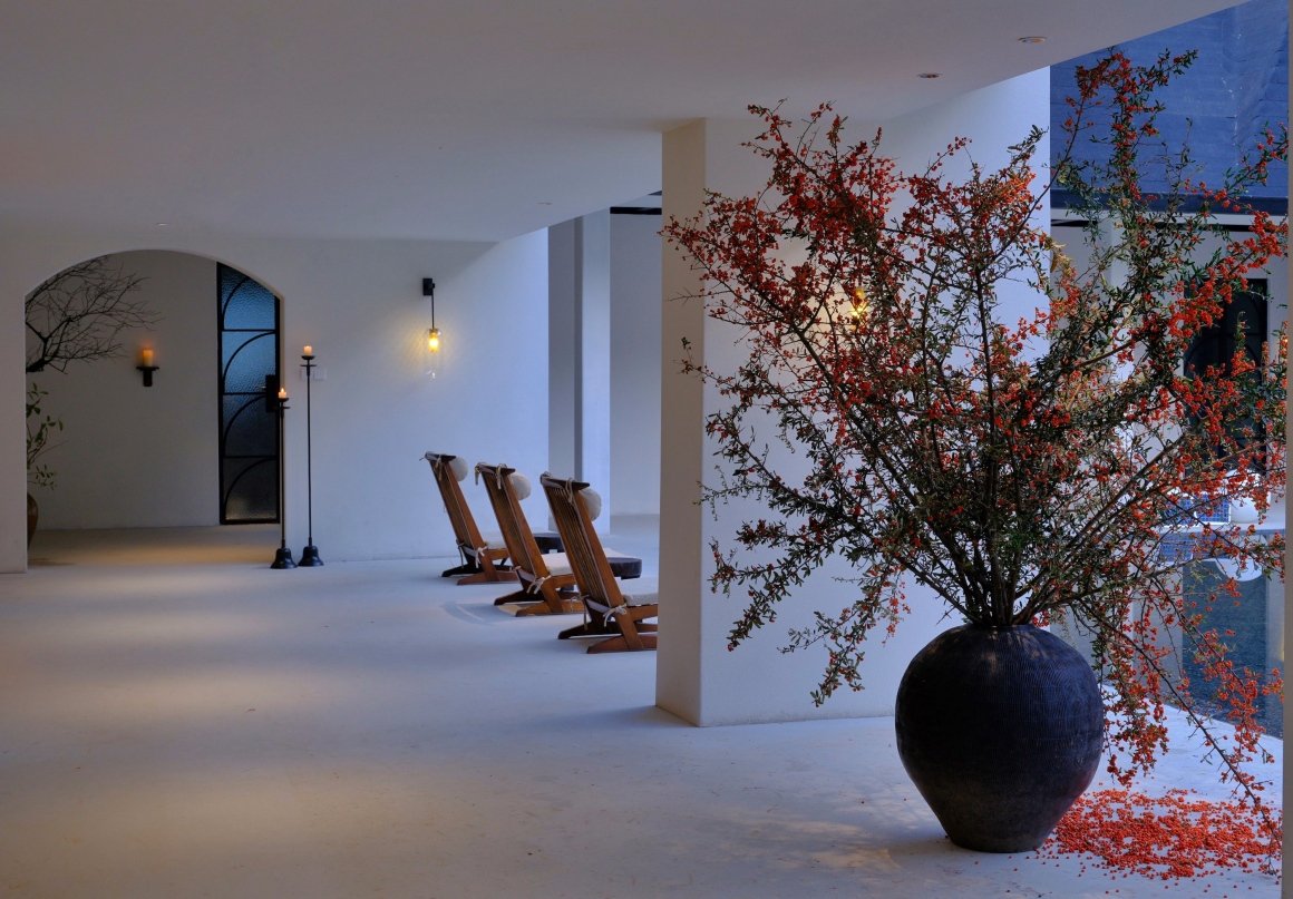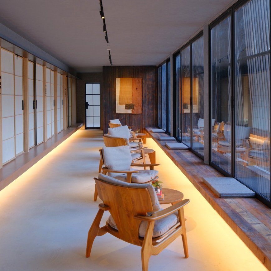The first floor of the main building houses a multifunctional resting area called “Xie,”. Xie is a transitional space that blends the cool natural exterior with the warm hospitable interior and invites people to experience the peaceful coexistence of two worlds. In the exterior part of Xie, near the reflecting pool, lounge chairs are tucked away in an unassuming quiet corner. The space fosters serenity and calmness.