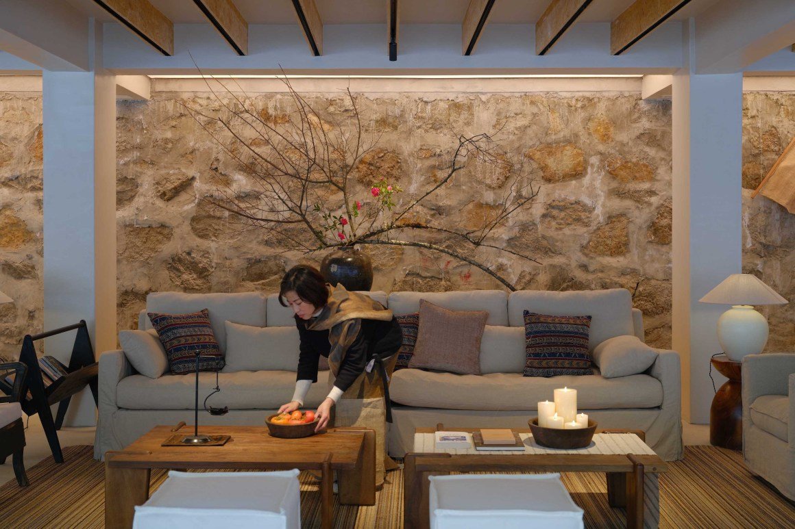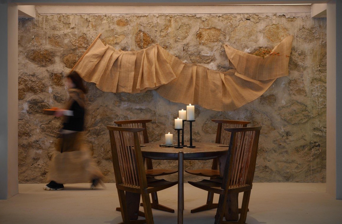 In the interior portion of Xie, we preserved the entirety of one of the original walls of the building. Furthermore, we used recycled furniture and fabrics from locals to create an immersive blend of historic influences with the renovated space.