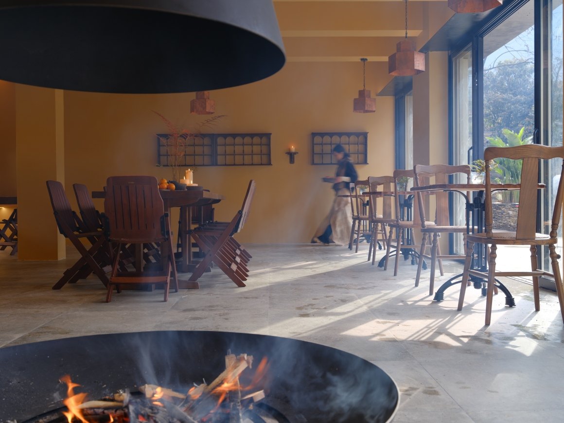 The dining area highlights local culture, with yellow hues representing the land in Tibet. The textured walls preserve authenticity, and diverse furniture breaks monotony, extending views to the mountains and enhancing immersion.