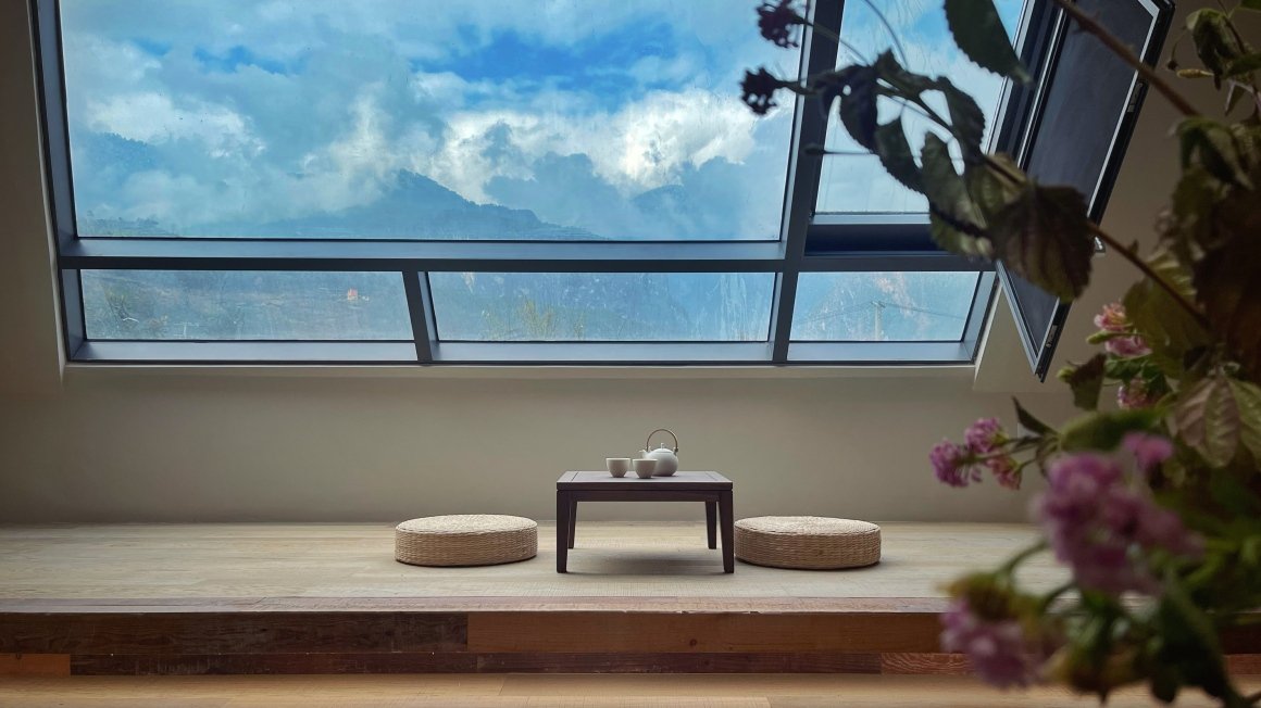The ever-changing clouds and mist bring dynamic, framed views of the mountain into the space, inspiring anticipation.
