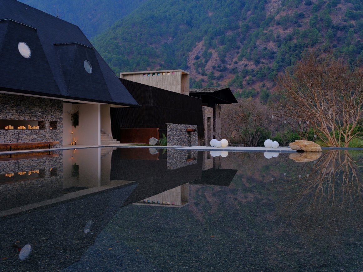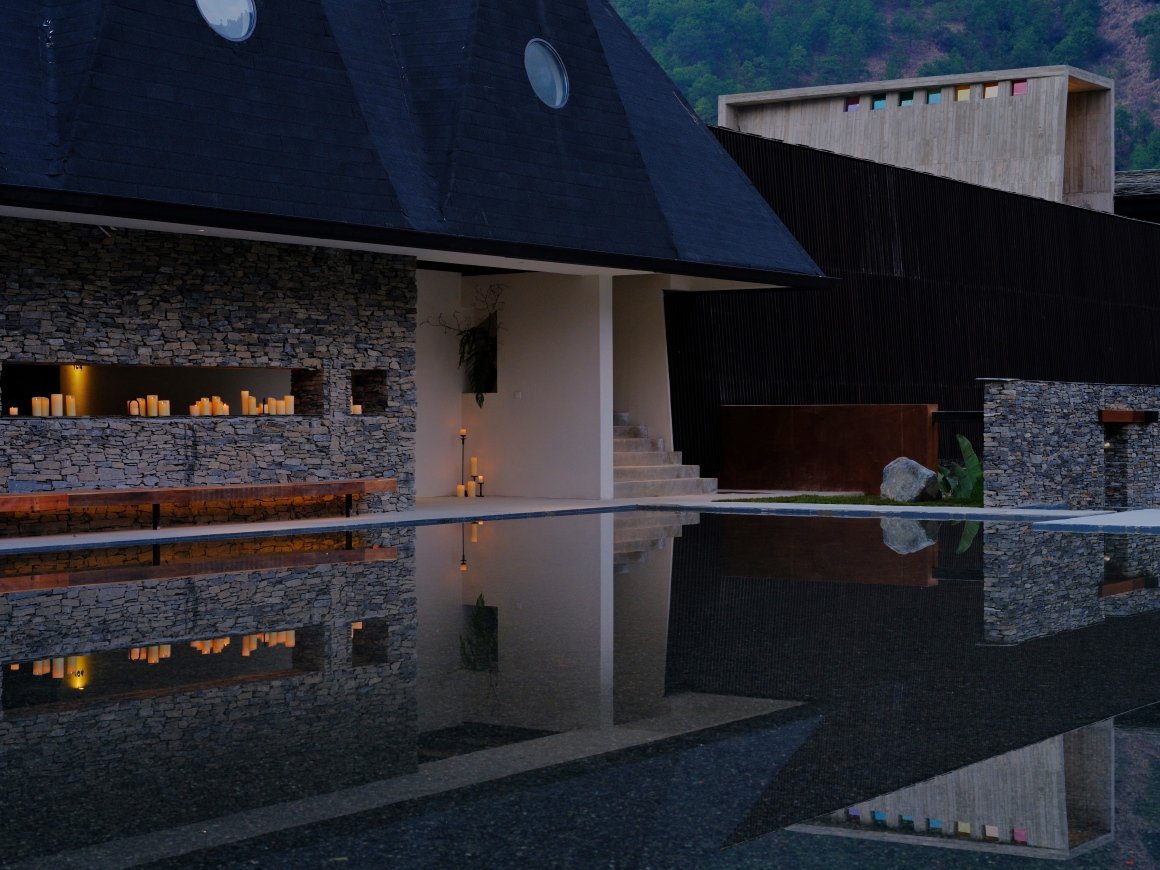 新的建筑体块被赋予人文绵延传递象征性的同时,也塑造着空间的独特性。主楼面前的镜面水池,将建筑与天空在水面的反射下形成对称式的构图,在群山环绕的背景衬托中显得尤为干净纯洁。