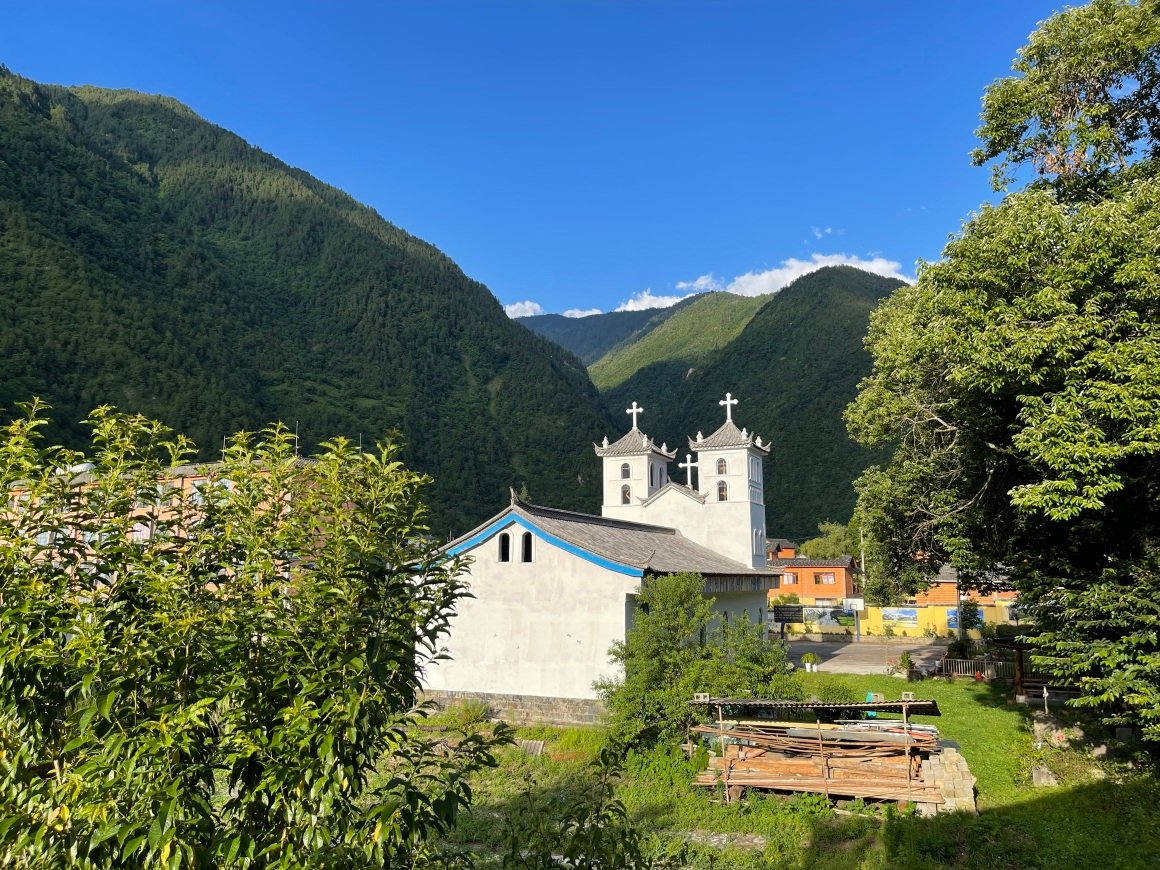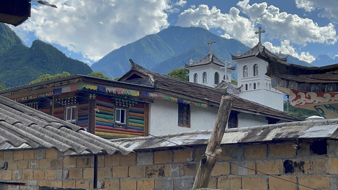 进入丙中洛远远就能看到白色的重丁教堂伫立在村子的中央,丁大妈的家就在重丁教堂的旁边。信奉天主教的丁大妈,掌管着教堂的大门钥匙,她时常在教堂中吟唱藏语的圣诗。
