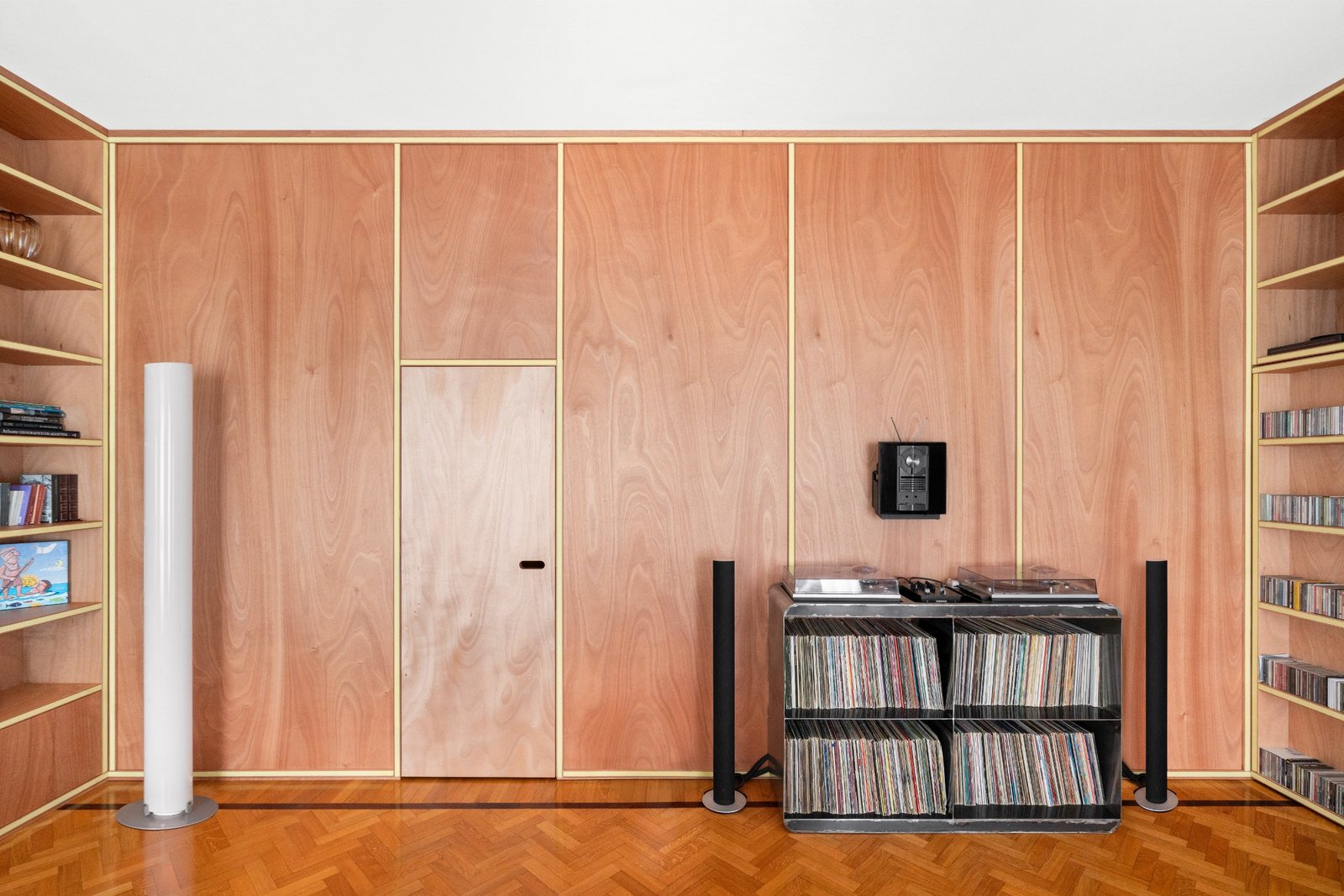 In the living room, the wood completely clads the walls, save for a row of windows. The wood integrates bookshelves and the TV against herringbone floors and a bespoke sofa designed for the project. The door leading into the room is clad in a lighter wood, while egress is accessible via an opening through the bookshelf (to the dining room) and a concealed door hidden within the shelving (to the hallway).
