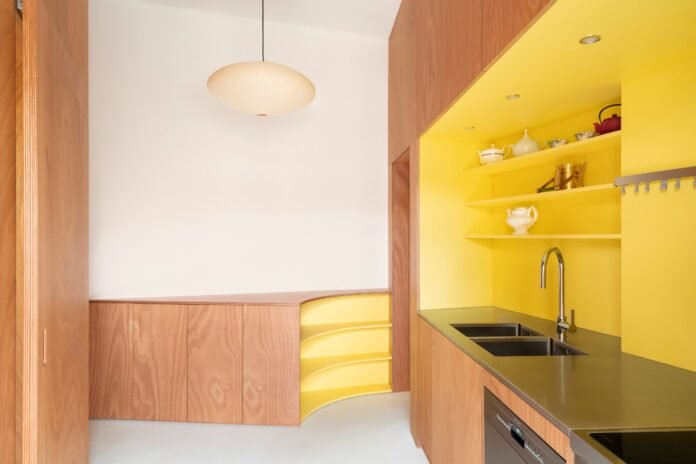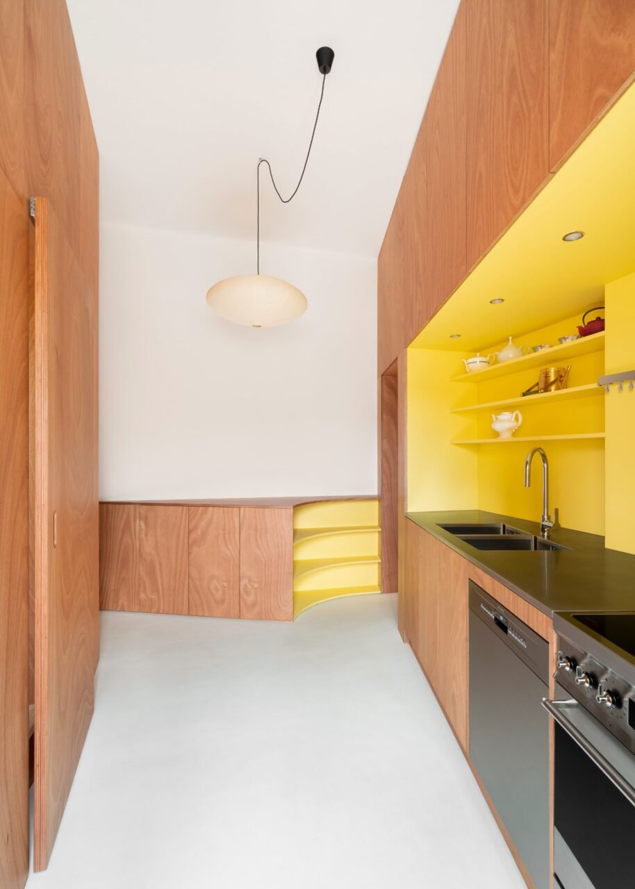 The design plays with geometry here, angling the kitchen counter on a diagonal in opposition to the gridded, box-like organization. The rectilinearity is further contradicted by elements of curvature, namely in the cabinetry that curves along the way to create space for people coming and going, marked by its bright yellow panels.