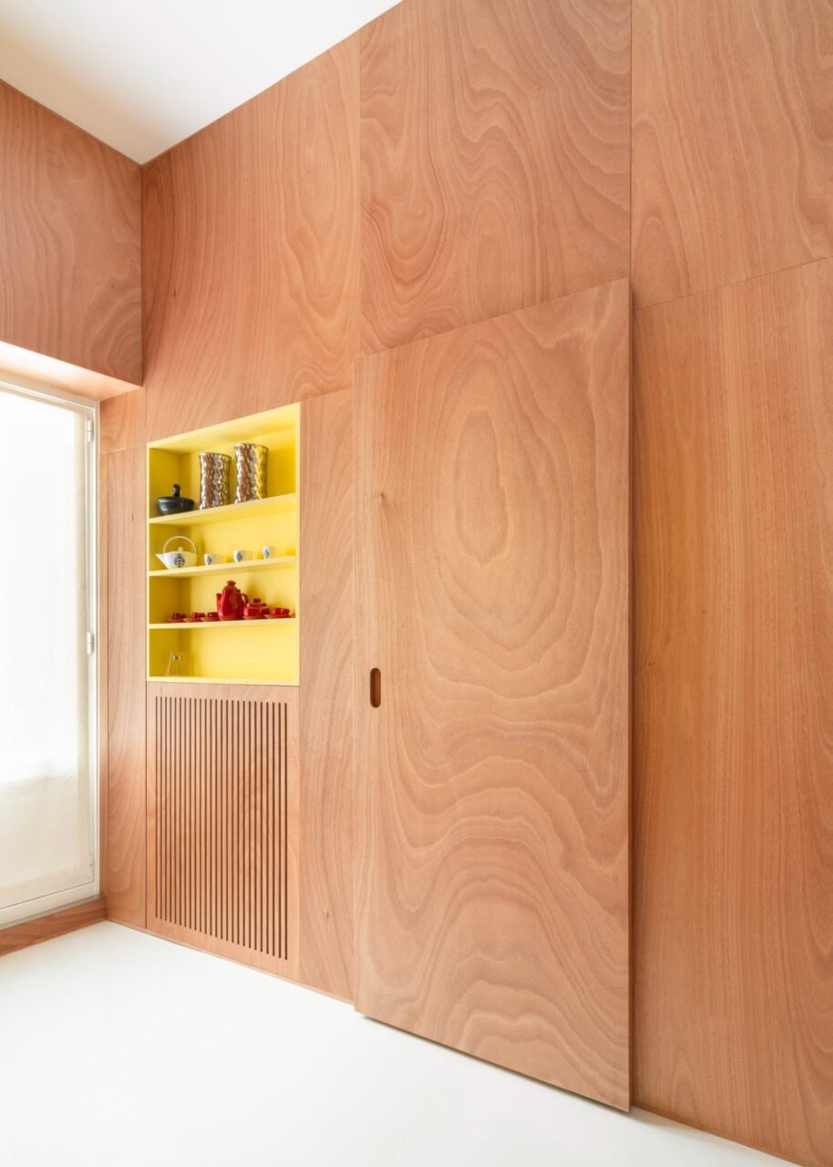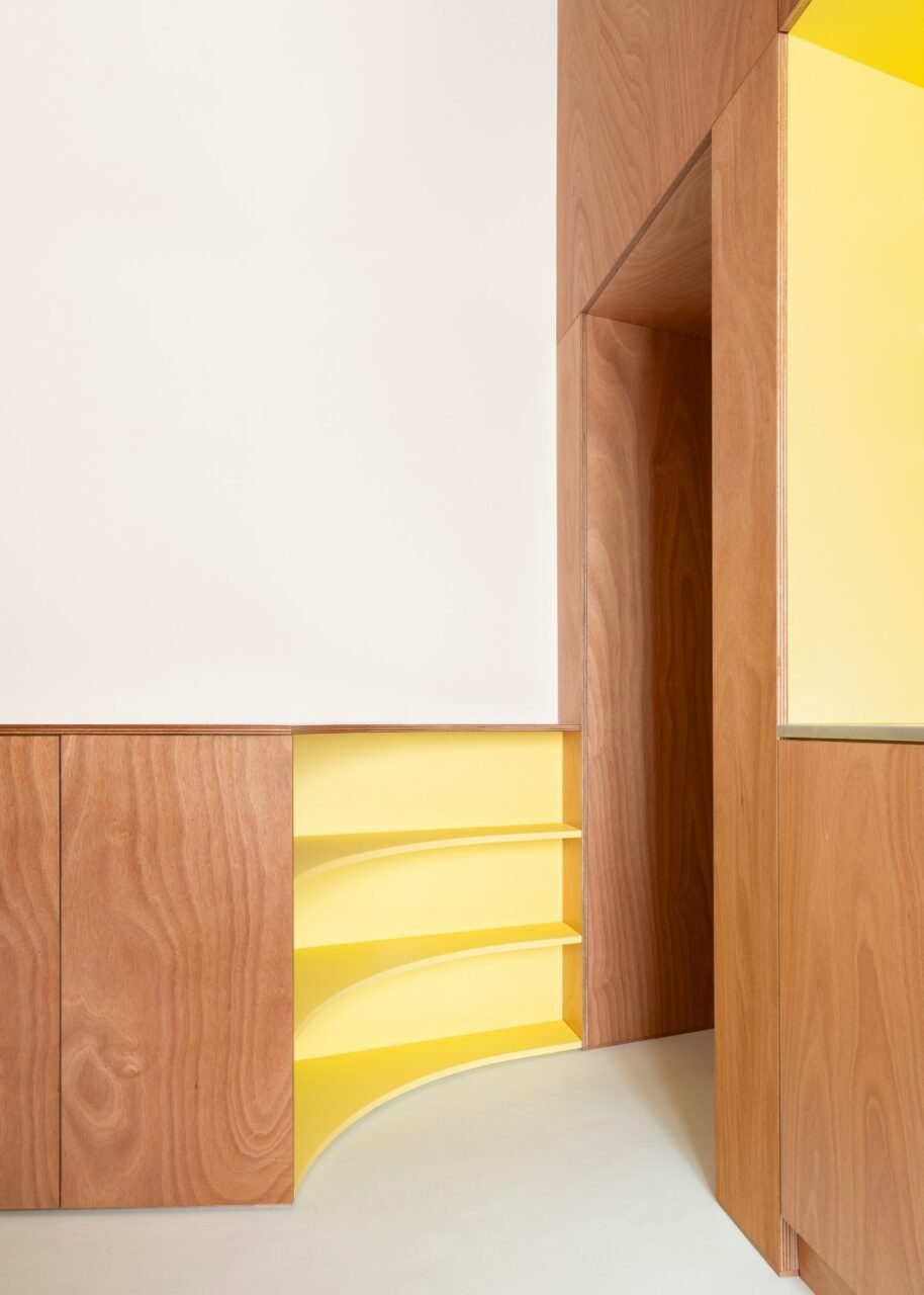 The culmination of this emerges in the kitchen where custom yellow inserts and stainless steel merge with the millwork. Their bright appearance stands in contrast to the concealed portals: the wood panel that slides to reveal an opening or the doorway tucked at the end of swooping millwork.