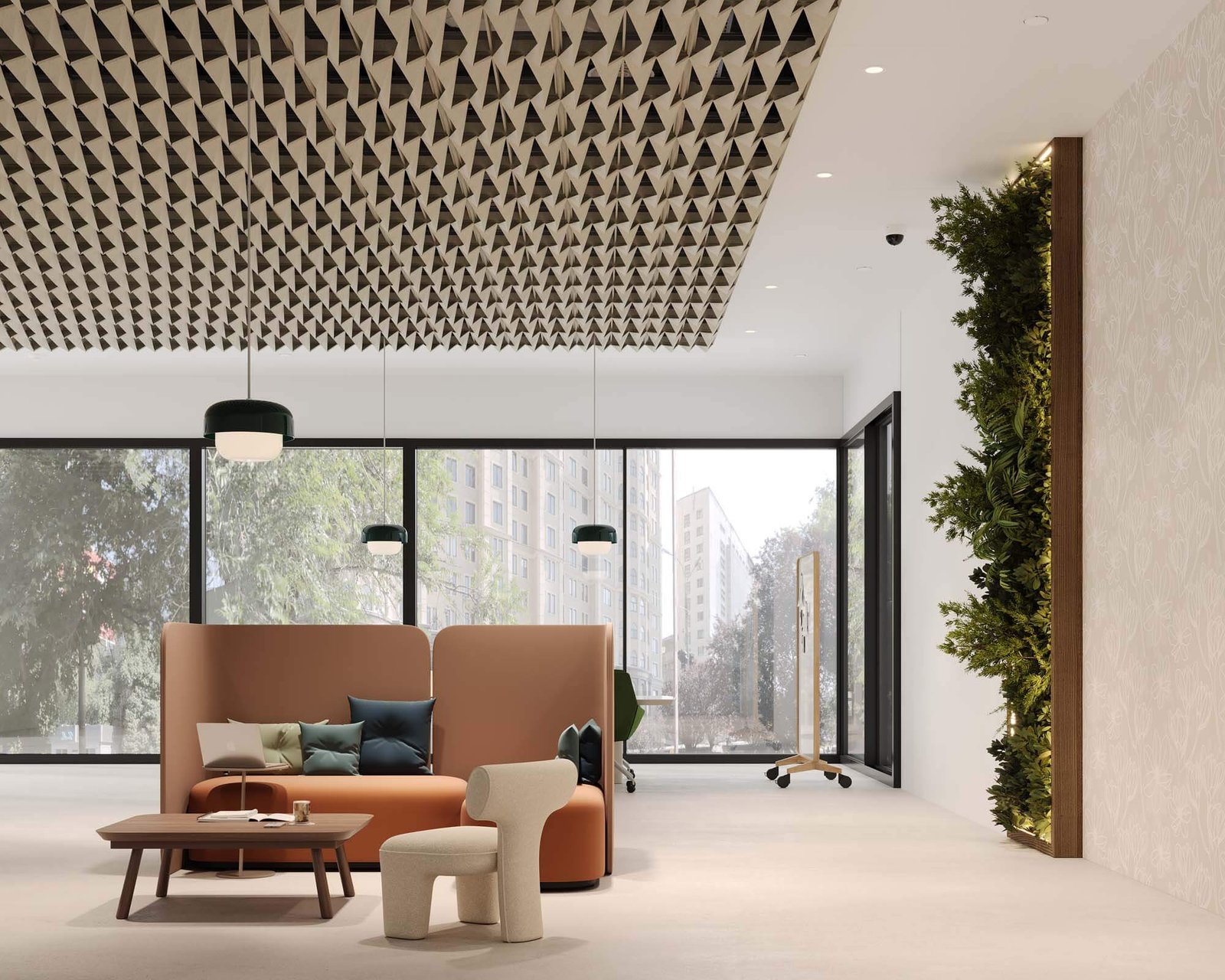 Mathematically engineered angles and folds inform this collection of ceiling frames that play with light and shadow for a mesmerizing acoustic solution.