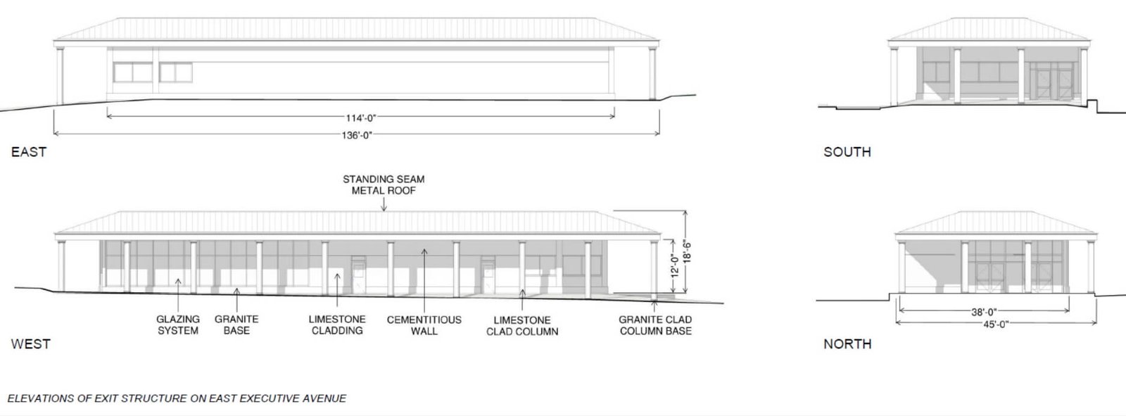 The low-lying structure would have a 12-foot ceiling height, and a hipped, standing seam metal roof, modeled after existing security booth facilities on the site. Its west facade would have a limestone-clad colonnade, and a granite base.