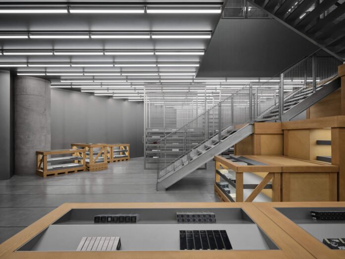 The flagship spans two floors, connected via metal stairs that rest atop cargo boxes. Not just decoration, the boxes are integrated into the stairs and hold product. This cleverly merges product display, circulation, and inventory into a single system.