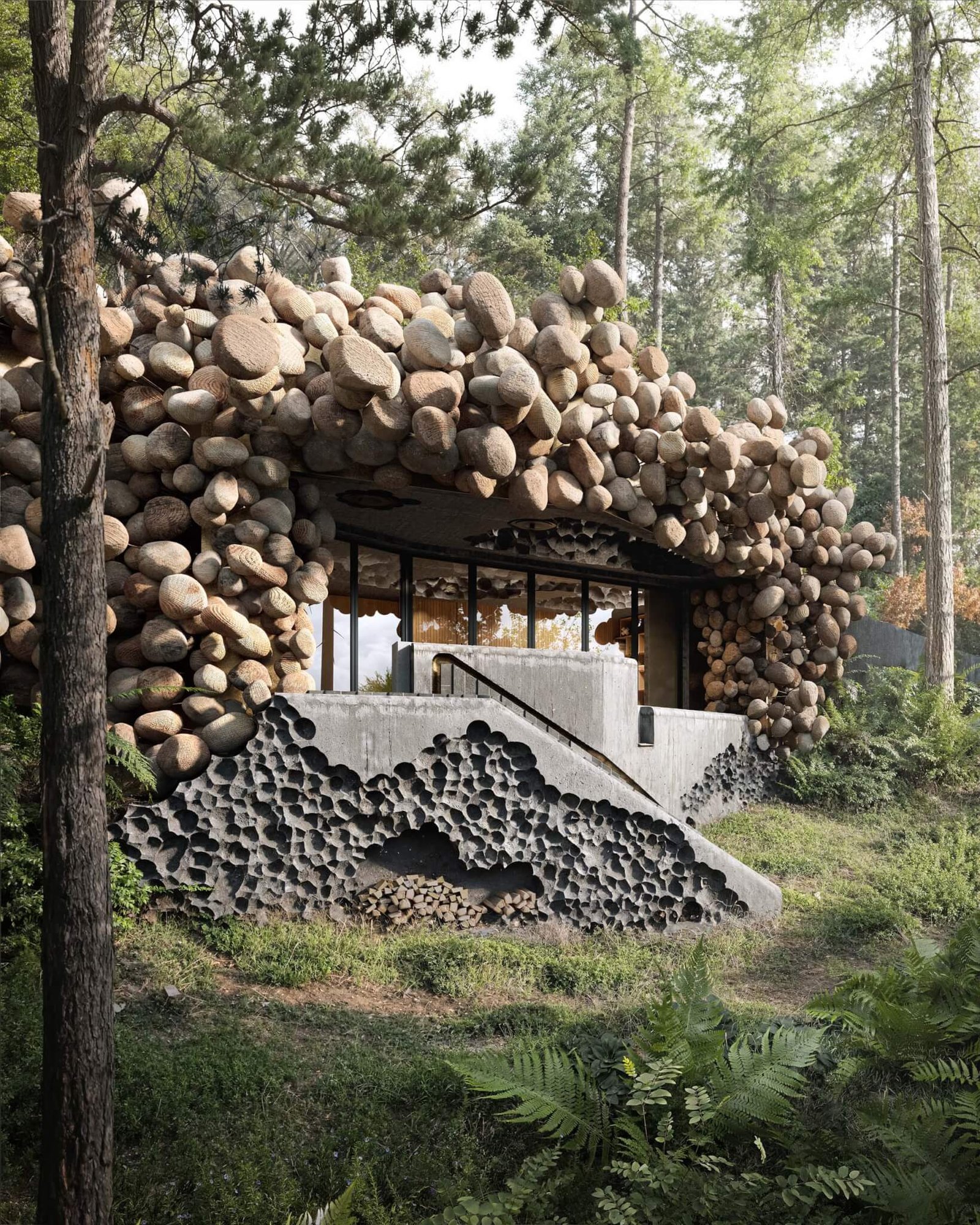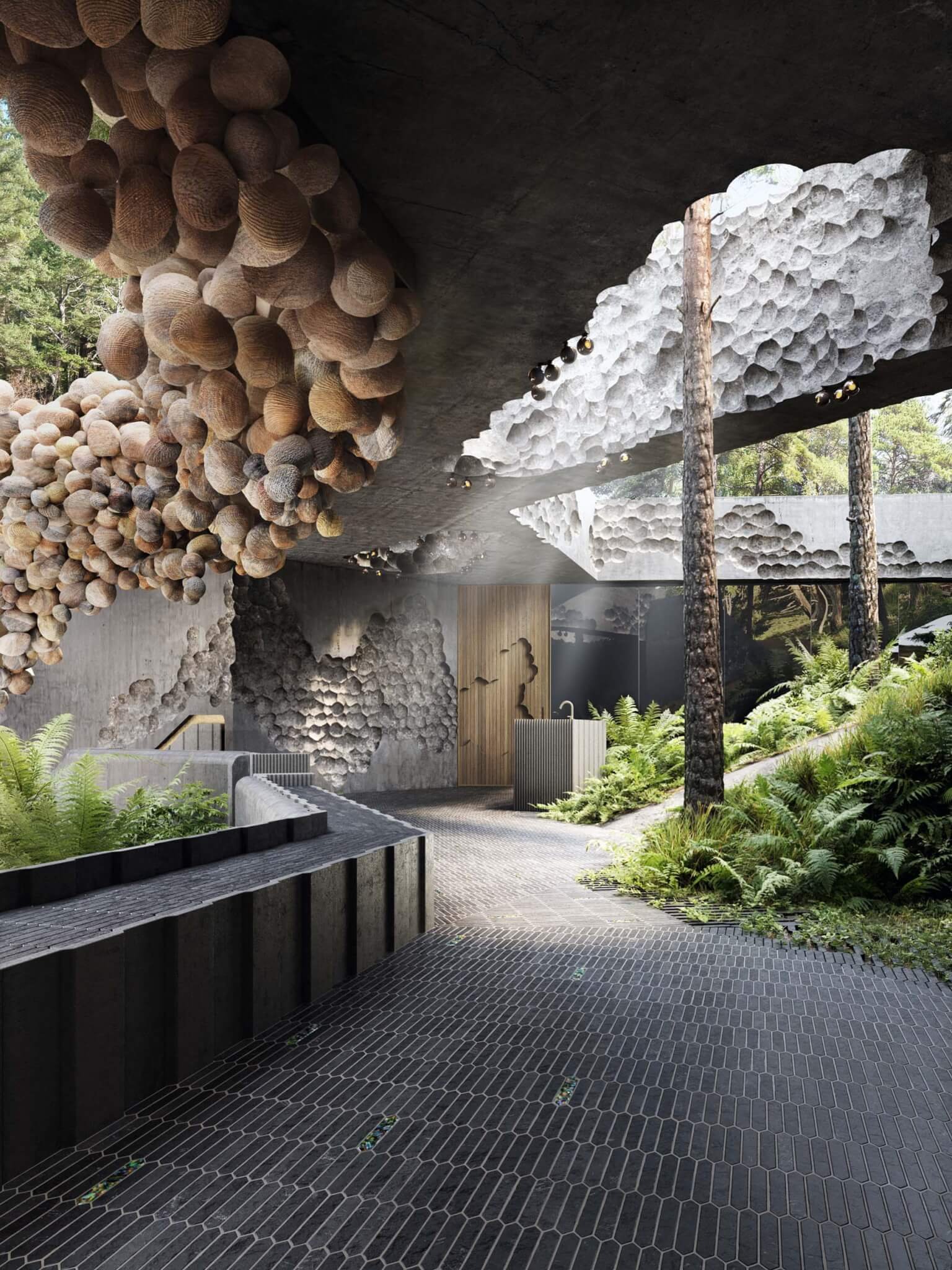 Arbel’s design fits the unspoiled setting: The residences are sited to disappear into the landscape. Under the planted roof, the space is something like a spider’s lair or a grotto; black-concrete walls are punctuated with hollows of varying sizes that bubble across the project like the pocked faces of nearby bluffs. At times these recesses deepen to form an occupiable seat or foam upward into skylights.