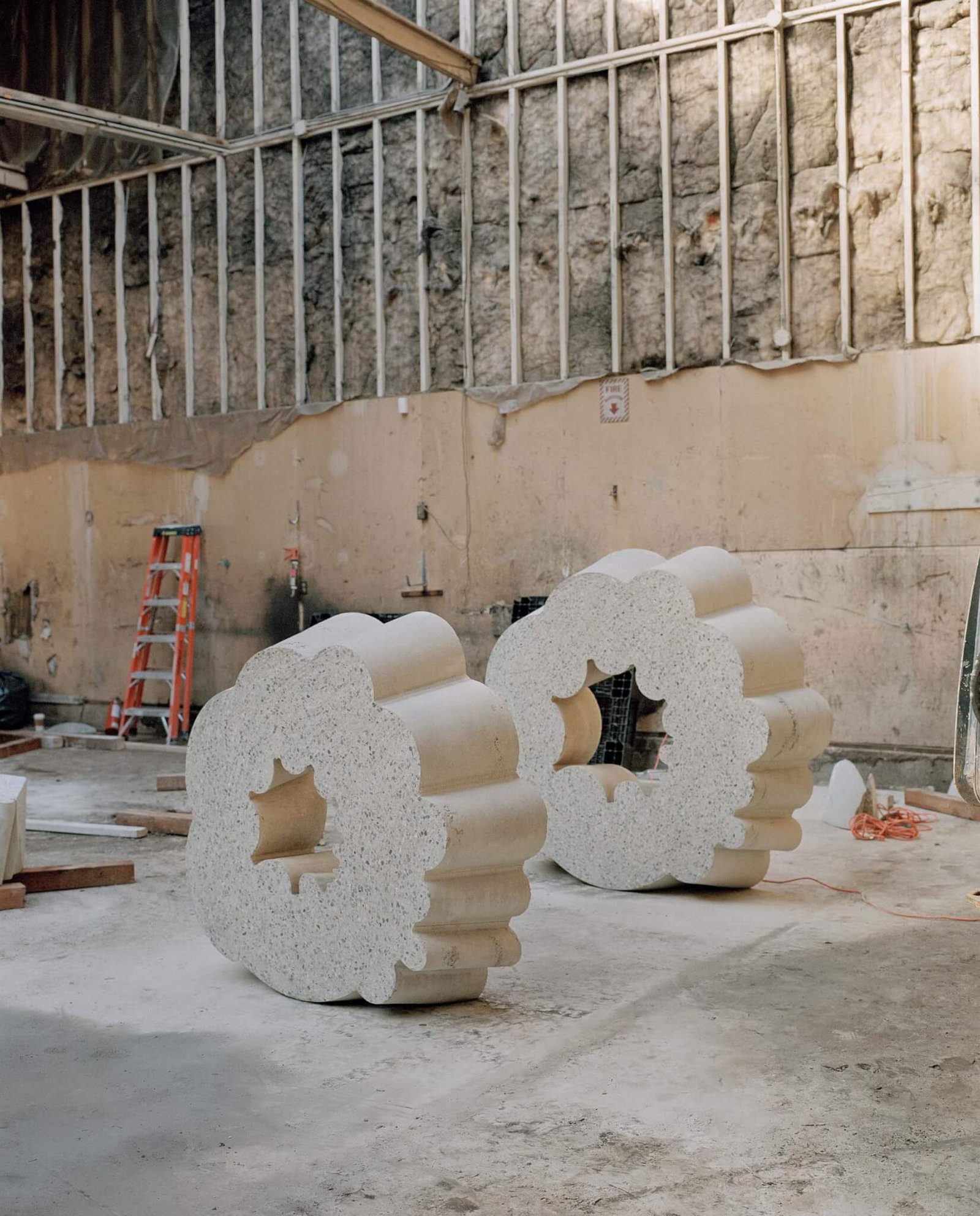 For 86.3, Arbel initially wanted to create the void forms by using hay bales, but he eventually landed on using cinched piles of recycled plastic buoys harvested from the ocean. These “big, thick plastic buoys get beat up in the oceans, and they come to shore deformed like seed pods or like edamame beans or something,” Arbel recalled. Wet hay also causes a problem with spontaneous combustion.