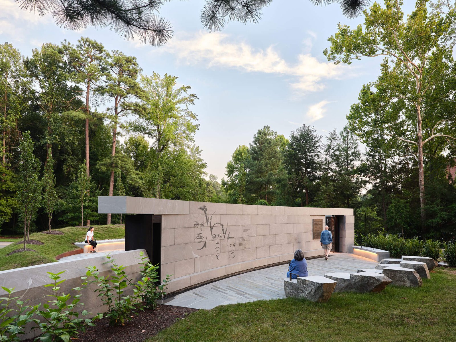 The man, woman, and child engraved into the wall were derived from descendant family photographs that designers encountered during the community engagement process.