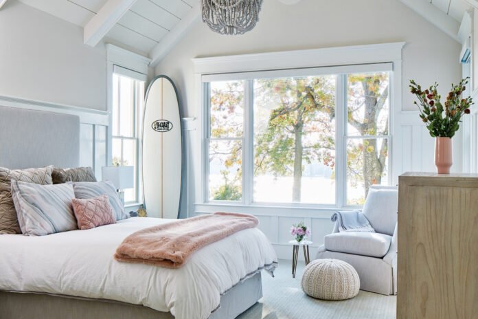 “There’s something about living by the water that brings me a sense of calm,” declares Bethany Beach custom builder Marnie Oursler, who recently completed her own vacation getaway on the Severn River in Annapolis. She hired Purple Cherry Architects to design the coastal Cape Cod-style abode, which features a guest room (pictured) with expansive water views.