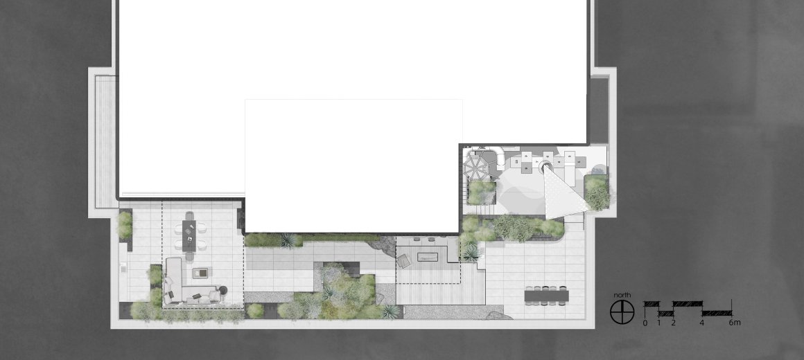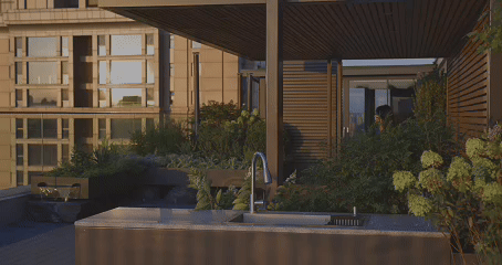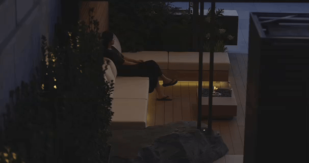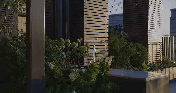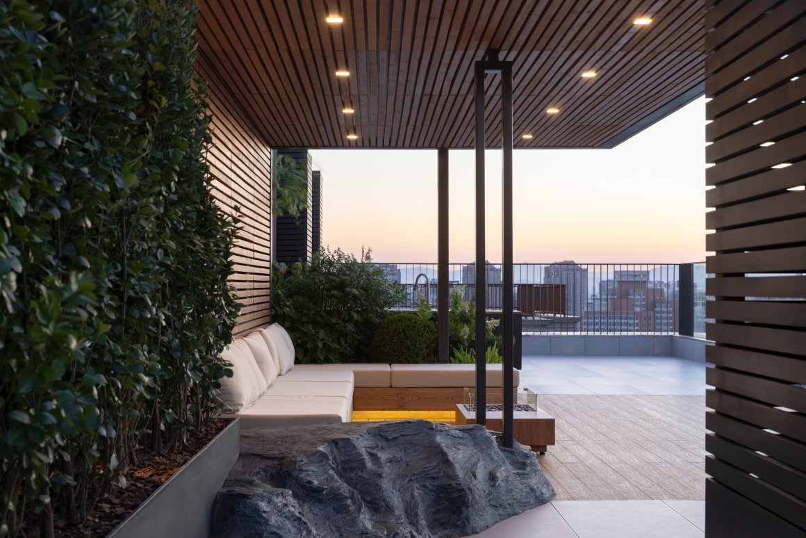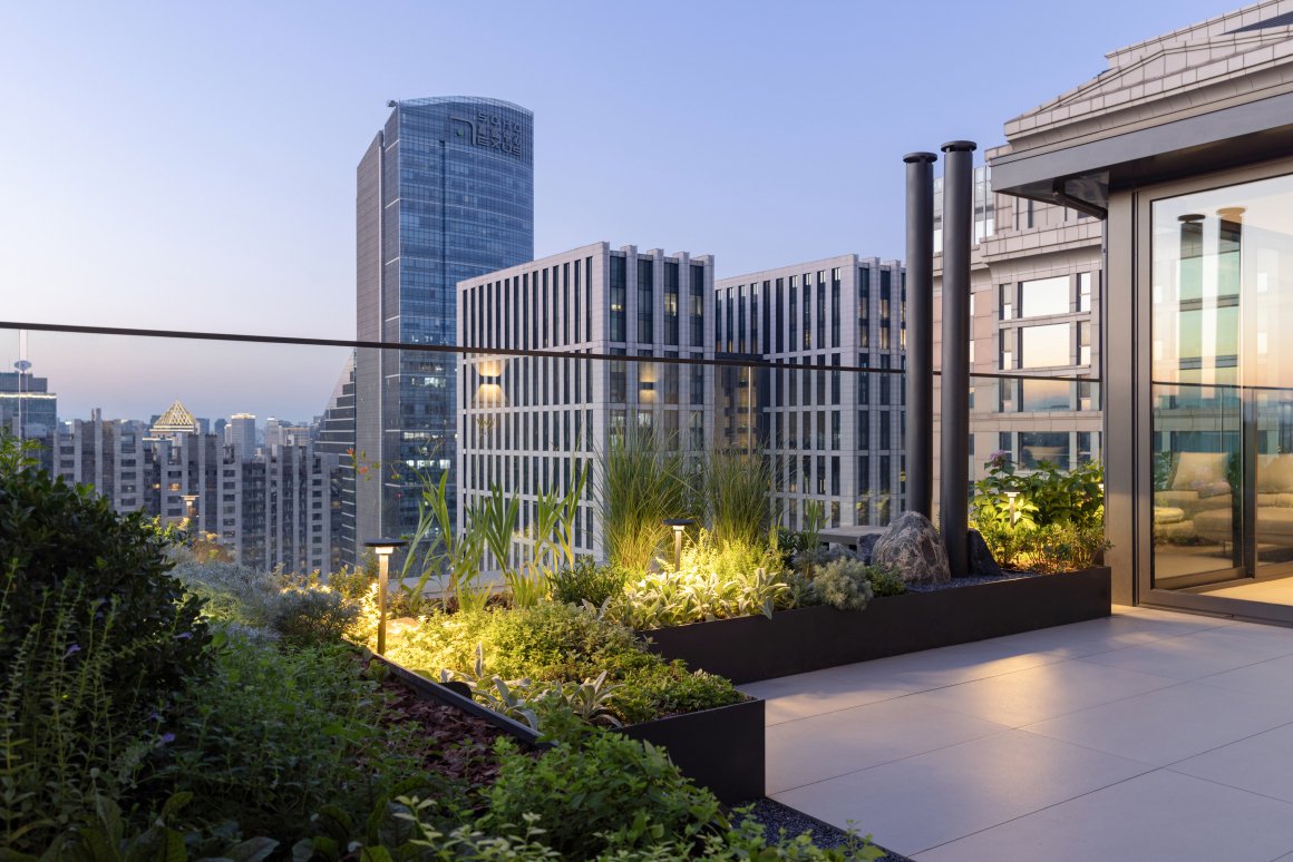花园留了一个一百平左右的平台,天台上可以举办一个很大的聚会,从公司的高管到招待贵客,孩子的生日宴会,可以把同学都请过来。这是一个可以无限转场的空中花园,欣喜是短暂的,幸福才是源源不断的日常。