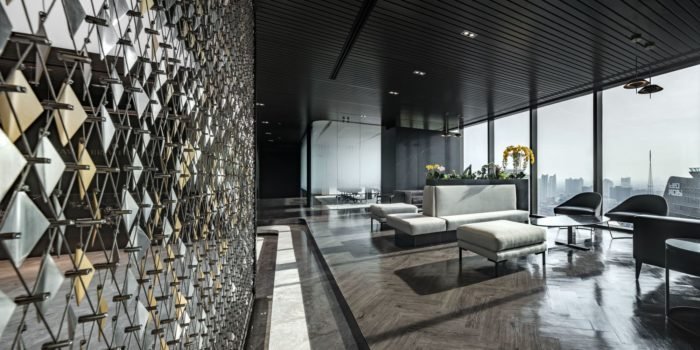 Where The Legend Meets Innovation. The design is focused on simplicity and constancy to essentially represent the “Singha heart”. Also, the movement of the river concept is used to balance the motif in the lobby area at the Boon Rawd Brewery Headquarters at Singha Complex Building. Minimal in color schemes and forms yet detailed in materials, and patterns, the lobby has created “Singha” symbolic meaning which reveals Thainess in itself.