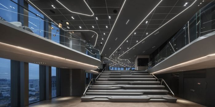 In order to simulate the natural lighting, a stretch ceiling is installed in the central area. The additional benefit of the ceiling is also to reduce the detail in interior design and to lead attention to the kinetic wall which is purposely designed to move freely resembling the moving water surface.