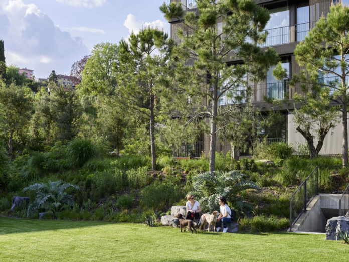 De Molfetta Strode Landscape Architects: Casarico Park is located in southern Switzerland, at the intersection of alpine and Mediterranean environments, which results in a wide range of plant communities. The mild climate and rich geology of the region generate lush landscapes that juxtapose the anonymous urban sprawl characterizing the valleys. Within this context the new neighborhood sits at the threshold between the fragmented suburbs of the city of Lugano and its protected natural areas of forests, mountains, and lakes. However, recent research on climate change indicates that within the next decades the city’s climate will be closer to the average climate of Naples, Italy. This is the premise for the ecological strategy of the project and for the definition of resilient plantings for climate change.