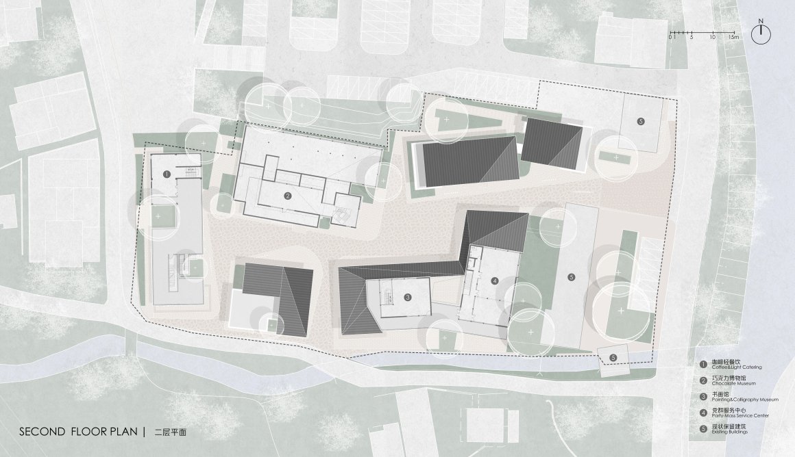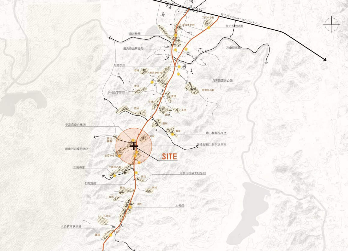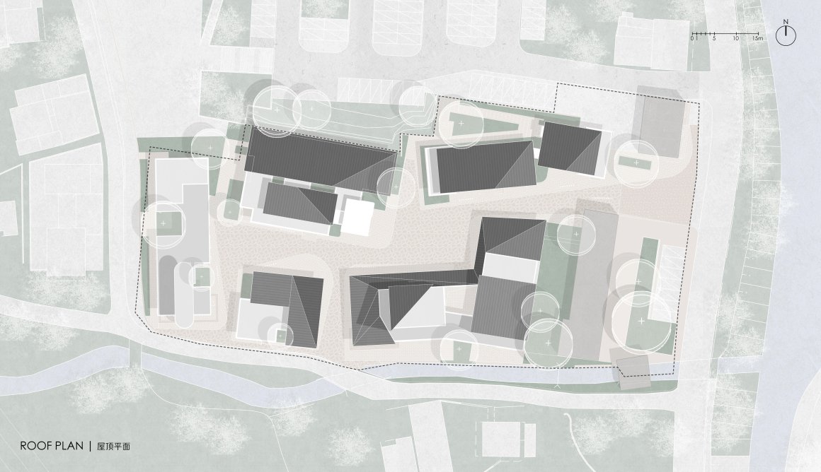 Upon fulfilling the programmatic requirements, we established the following design strategies that both keep the collective environmental memory of local villagers and meet visitors’ expectations for an authentic rural experience:1 “Block/Village-Style” composition with massing in Small-Scale to mitigate the visual impact and perceived “intrusiveness” of the 3,030㎡ building complex within the existing rural context.2Apply contemporary design method to manage spatial construction while targeting at emulating a vernacular ambiance. Try to bridge different styles between the northern and southern tourism developments.3Enhance visual and physical connectivity between space of this projectand surrounding mountains, adjacent villages, and parking areas.